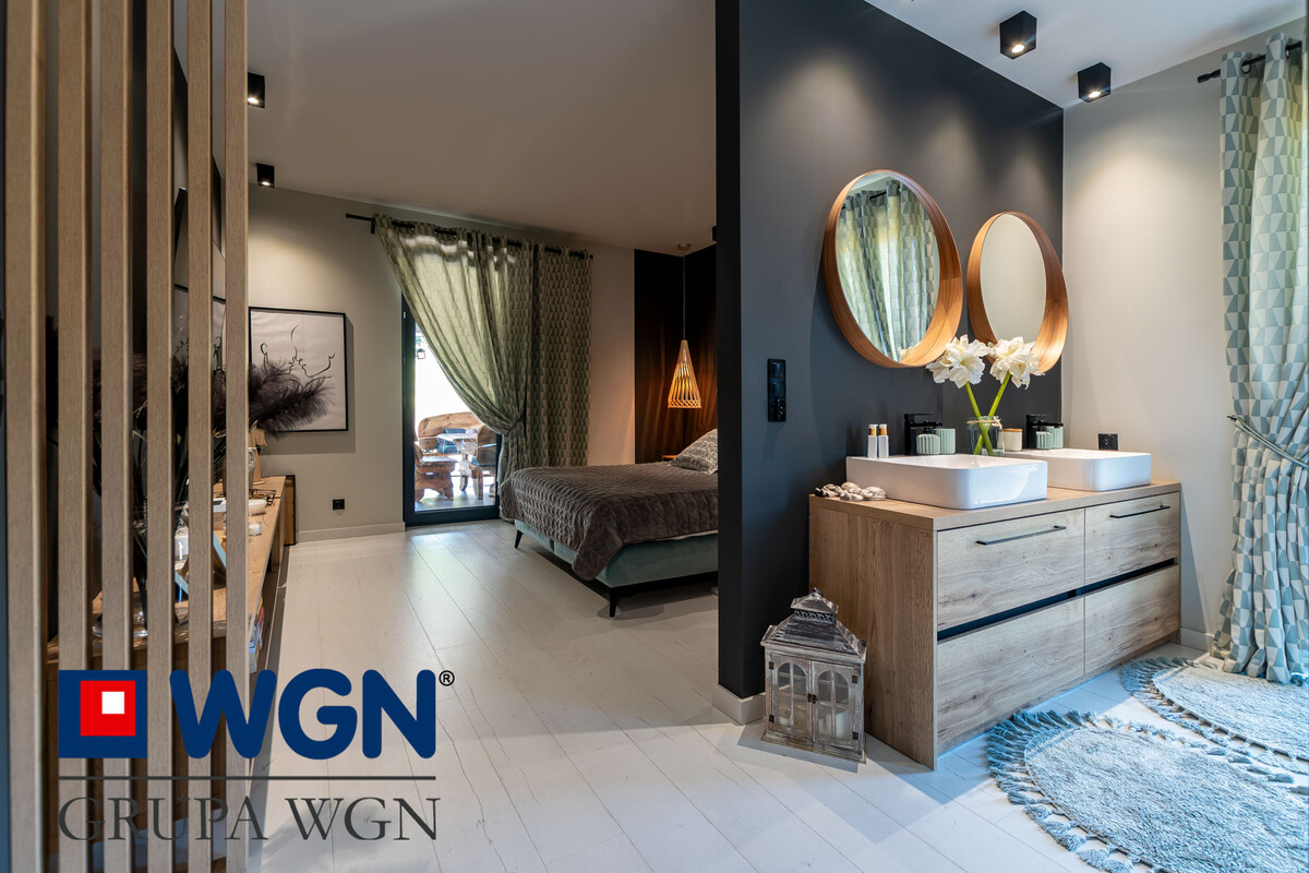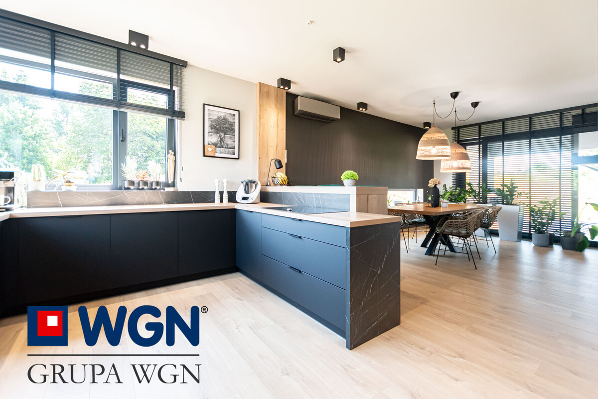 Ważną częścią nieruchomości jest przestronny salon z jadalnią i otwartą kuchnią o łącznej powierzchni ponad 54m2. Kuchnia w literę "U" z dużym blatem roboczym w kolorze dębowym, duże szafki i szuflady z miejscem do przechowywania oraz nowoczesnymi sprzętami AGD w kolorze czarnym w większości firmy Samsung, to tylko krótka charakterystyka tej kuchni. Kuchnia jasna, pełna światła dziennego dzięki dużym narożnym oknom, przez które możemy zobaczyć całość podjazdu oraz część ogrodu. Nowoczesne rolety w oknach przygotowane na wymiar, robią niesamowite wrażenie. Do tak pięknej kuchni, nie mogło zabraknąć równie pięknej jadalni, która składa się z dużego stołu z blatem drewnianym, przy którym każde spotkanie z bliskimi, czy rodzinne śniadanie będzie niezapomniane. W salonie znajduje się klimatyzacja oraz kominek, który z pewnością umili każdy wieczór. Salon z dużą narożną kanapą, to idealne miejsce do odpoczynku, przy dobrej książce, czy spędzając z rodziną przy ulubionym filmie. Ściana telewizyjna to kolejne akcenty przygotowane przez projektantkę, lamele, czarna ściana oraz duża szafka rtv, nawiązująca kolorystycznie do reszty mebli, to robi po prostu wrażenie i warto przyjść i poczuć ten klimat na żywo.