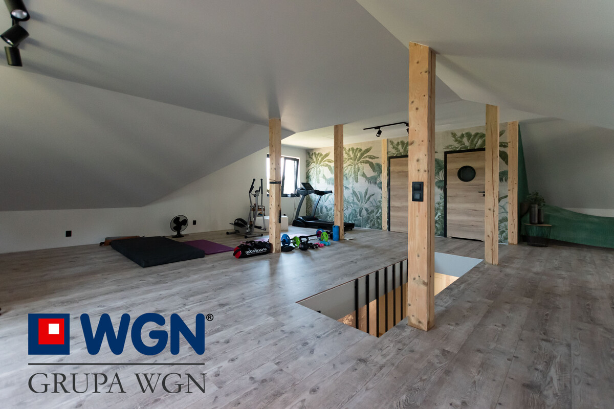 Poddasze nieruchomości to otwarta przestrzeń o powierzchni 75,76m2. Zaaranżowana aktualnie na siłownie, kącik do pracy i kącik telewizyjny. Mamy tam dodatkowe WC i pomieszczenie gospodarcze. ML Studio zaprojektowało także to miejsce i właściciel posiada projekt zagospodarowania tej przestrzeni z podziałem na kilka pokoi, lub jako oddzielne mieszkanie.