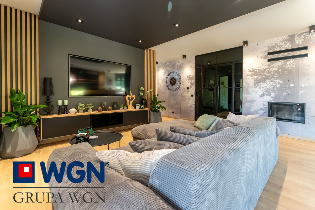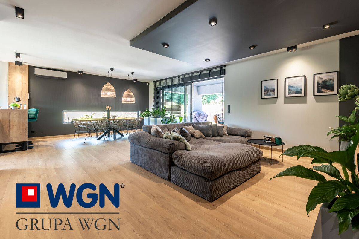 Ważną częścią nieruchomości jest przestronny salon z jadalnią i otwartą kuchnią o łącznej powierzchni ponad 54m2. Kuchnia w literę "U" z dużym blatem roboczym w kolorze dębowym, duże szafki i szuflady z miejscem do przechowywania oraz nowoczesnymi sprzętami AGD w kolorze czarnym w większości firmy Samsung, to tylko krótka charakterystyka tej kuchni. Kuchnia jasna, pełna światła dziennego dzięki dużym narożnym oknom, przez które możemy zobaczyć całość podjazdu oraz część ogrodu. Nowoczesne rolety w oknach przygotowane na wymiar, robią niesamowite wrażenie. Do tak pięknej kuchni, nie mogło zabraknąć równie pięknej jadalni, która składa się z dużego stołu z blatem drewnianym, przy którym każde spotkanie z bliskimi, czy rodzinne śniadanie będzie niezapomniane. W salonie znajduje się klimatyzacja oraz kominek, który z pewnością umili każdy wieczór. Salon z dużą narożną kanapą, to idealne miejsce do odpoczynku, przy dobrej książce, czy spędzając z rodziną przy ulubionym filmie. Ściana telewizyjna to kolejne akcenty przygotowane przez projektantkę, lamele, czarna ściana oraz duża szafka rtv, nawiązująca kolorystycznie do reszty mebli, to robi po prostu wrażenie i warto przyjść i poczuć ten klimat na żywo.