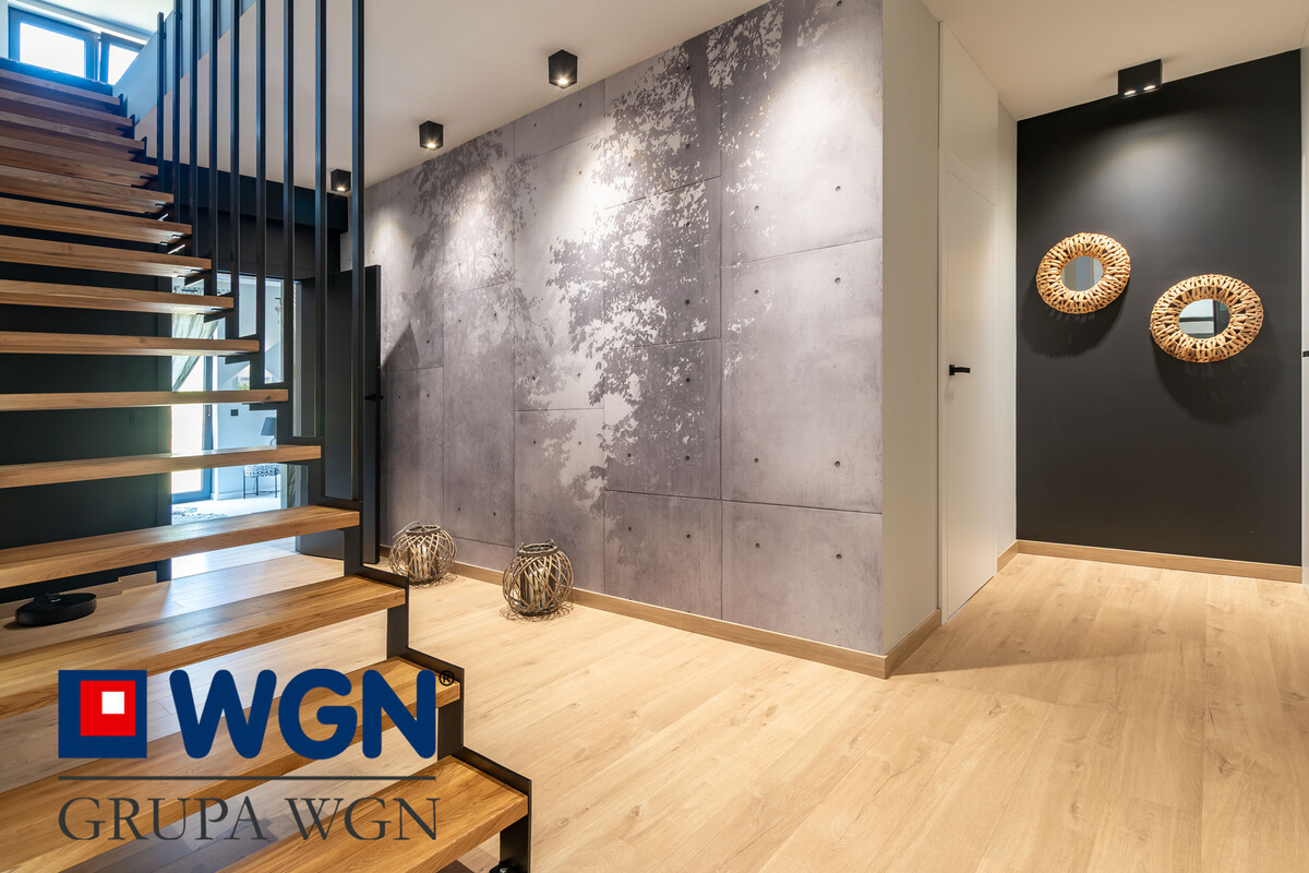Nieruchomość zaaranżowana tak aby spełnić oczekiwania najbardziej wymagających klientów. Sam projekt przygotowany przez ML Studio Moniki Leszczyńskiej daje nam gwarancję idealnego wnętrza, pięknie przygotowanego, w nowoczesnych kolorach z użytymi materiałami wysokiej jakości. Przekraczając próg domu, już możemy zauważyć piękną tapetę oraz duże szklane drzwi w kolorze czarnym, które nam mówią że tu po prostu jest pięknie i nowocześnie.