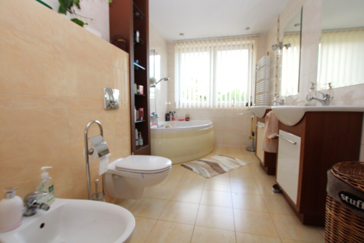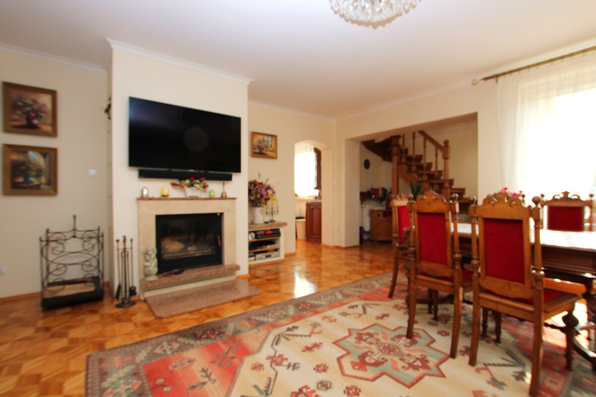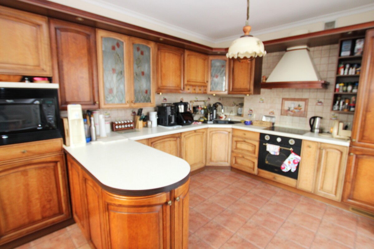 Serce domu stanowi obszerny salon (28 m²) z klimatycznym kominkiem, otwarty na kuchnię (ok.16 m²) z dębową zabudową w cenie. Z kuchni wyjście na duży, nowocześnie wykończony taras (ok.40 m²) z kutą balustradą – idealne miejsce do relaksu. Kolejna kondygnacja to sypialnie oraz duża łazienka z oknem, narożną wanną, bidetem i dwiema umywalkami.