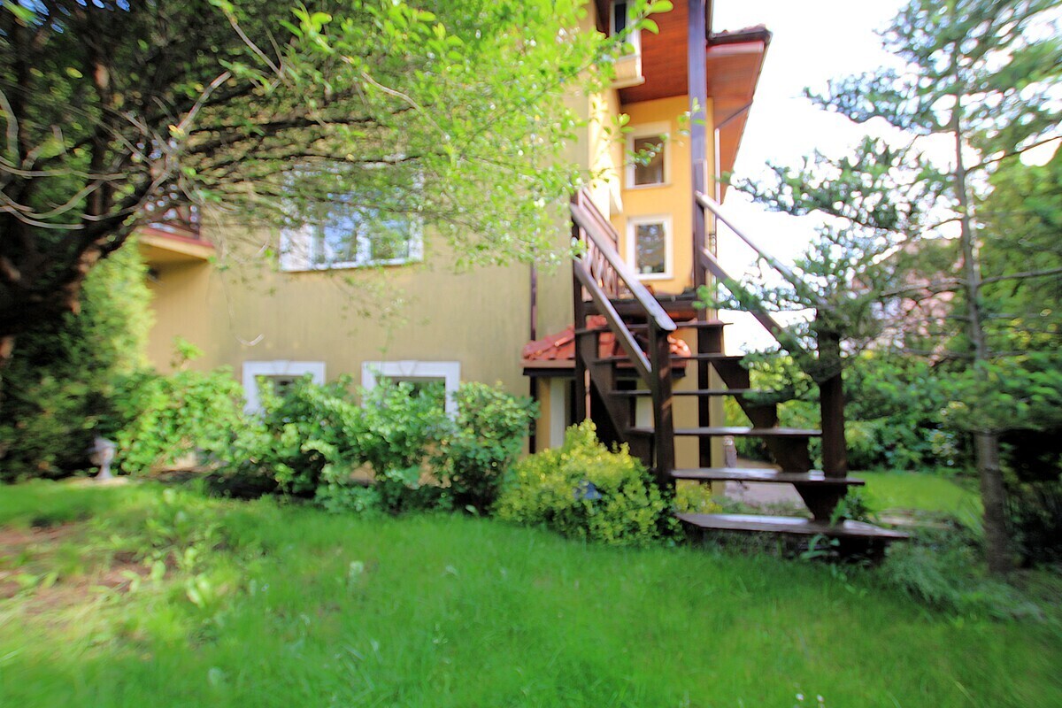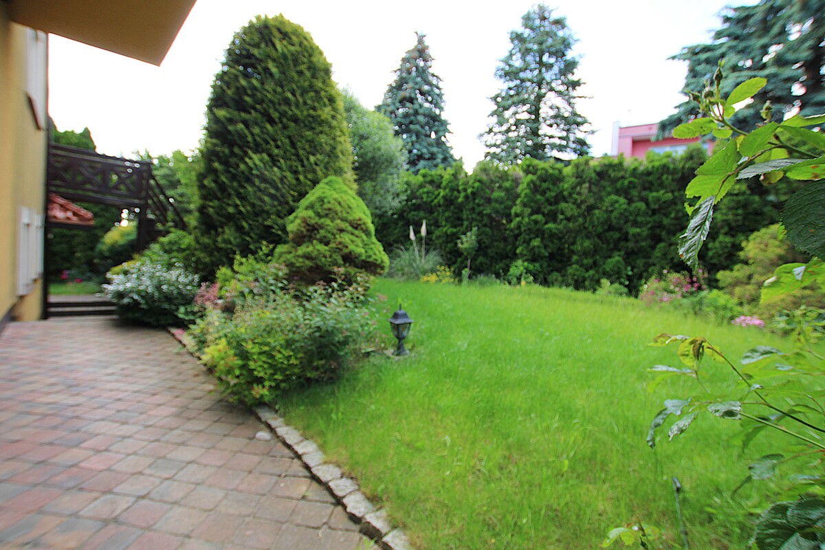 Urokliwy ogród z całoroczną roślinnością jest wyposażony w sterowany system nawadniania oraz osobny licznik na wodę "ogrodową". Cały dom chroniony jest przez system alarmowy.