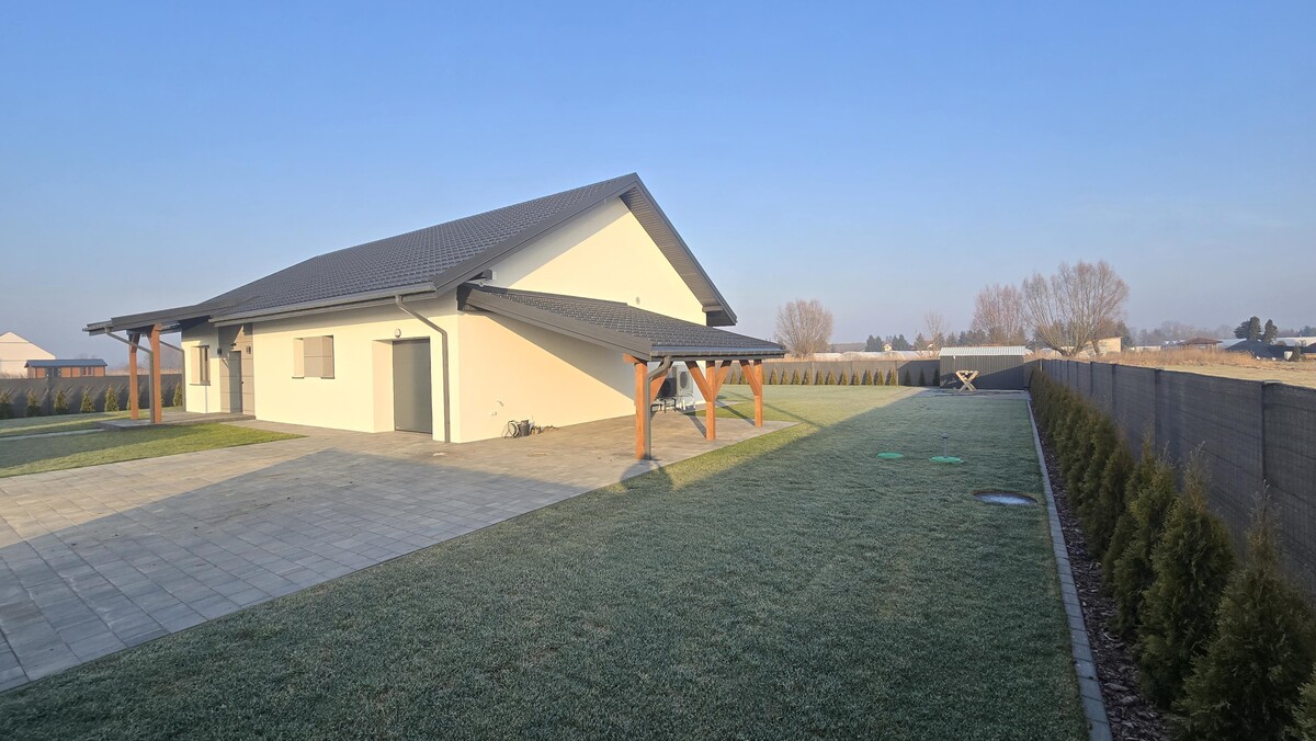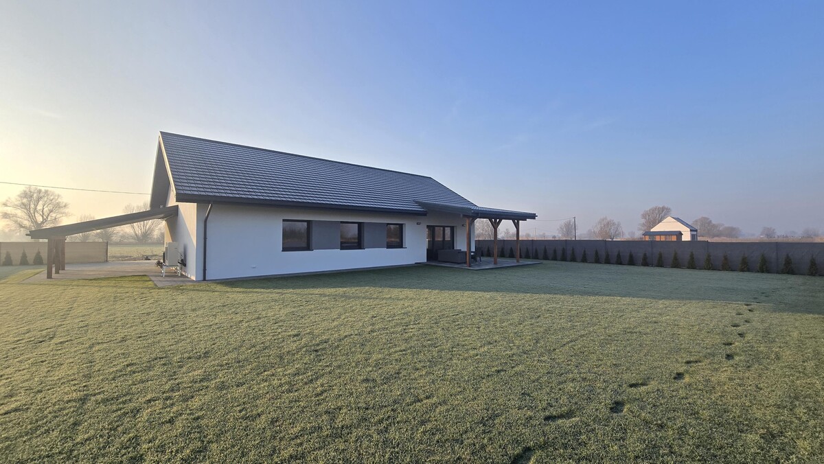 Nowoczesny dom parterowy z 2025 r. w Raczkach ElbląskichDach dwuspadowy (dodatkowy dach nad tarasem, wejściem oraz wiatą garażową). Usadowiony na działce o powierzchni 1558 m2.