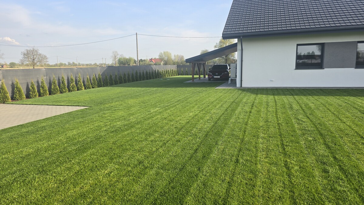 Ogrodzenie panelowe, trawa ułożona z rolki oraz system nawadniania automatycznego z siatką przeciw kretom.