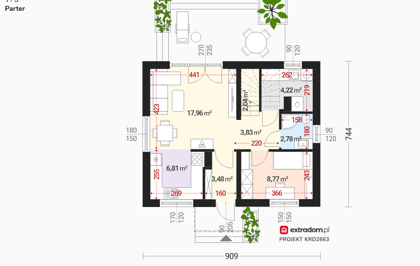 - Salon z wyjściem na taras, 4 pokoje, 2 łazienki, przedpokój oraz praktyczne pomieszczenie gospodarcze