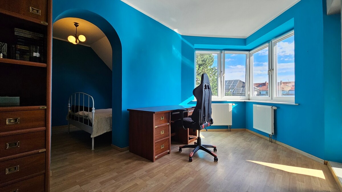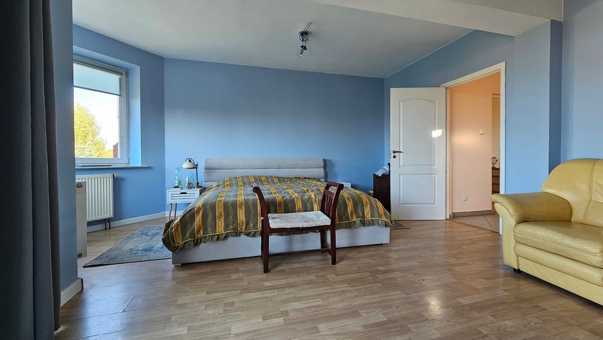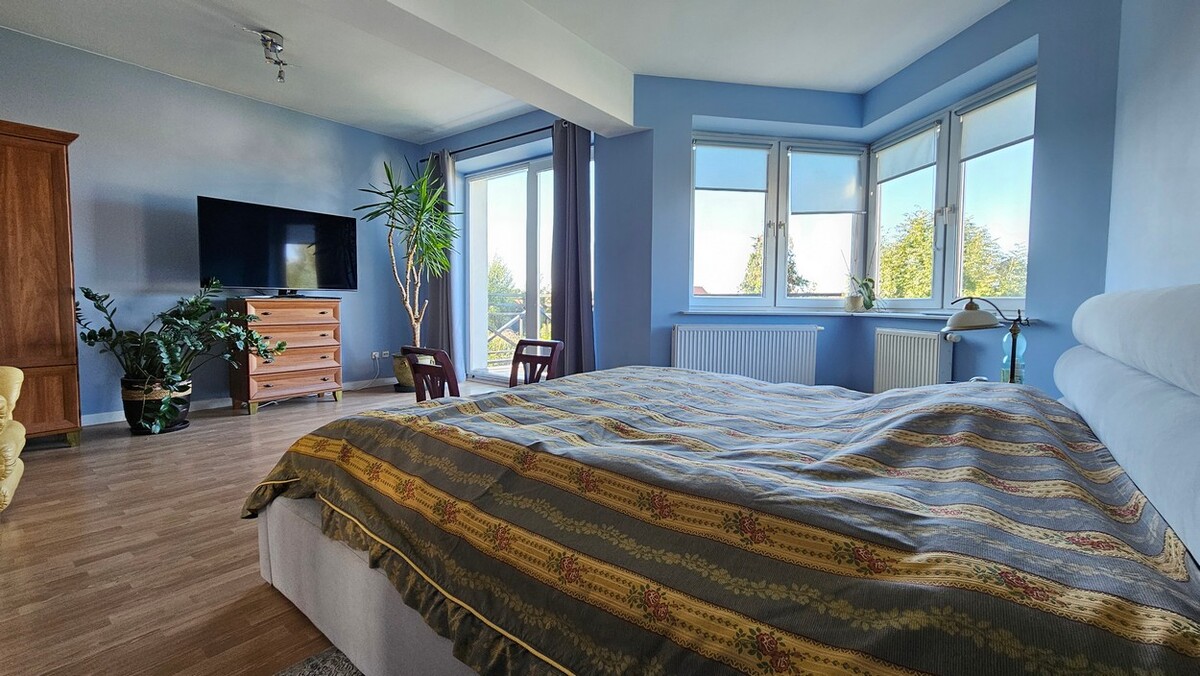Na drugim piętrze sypialnia z wyjściem na balkon, 2 oddzielne pokoje z dodatkowymi pomieszczeniami, w tym jeden z wejściem na balkon, holl i łazienka rodzinna /prysznic, wanna, WC/.