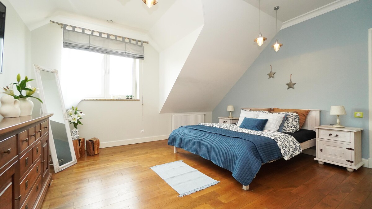 Na górze czeka: sypialnia z garderobą, dwie oddzielne sypialnie (w jednej zamontowana klimatyzacja), przestronna łazienka, oraz pokój wielofunkcyjny idealny na gabinet, salę do gier, siłownię czy pokój nastolatka, w tym pokoju podłączona jest pralka i suszarka.