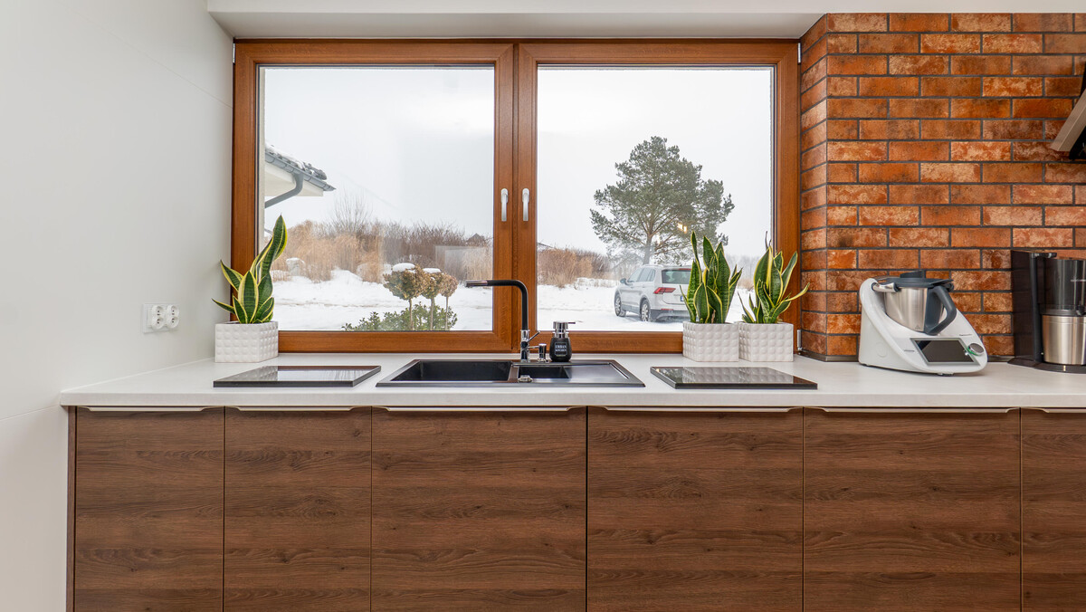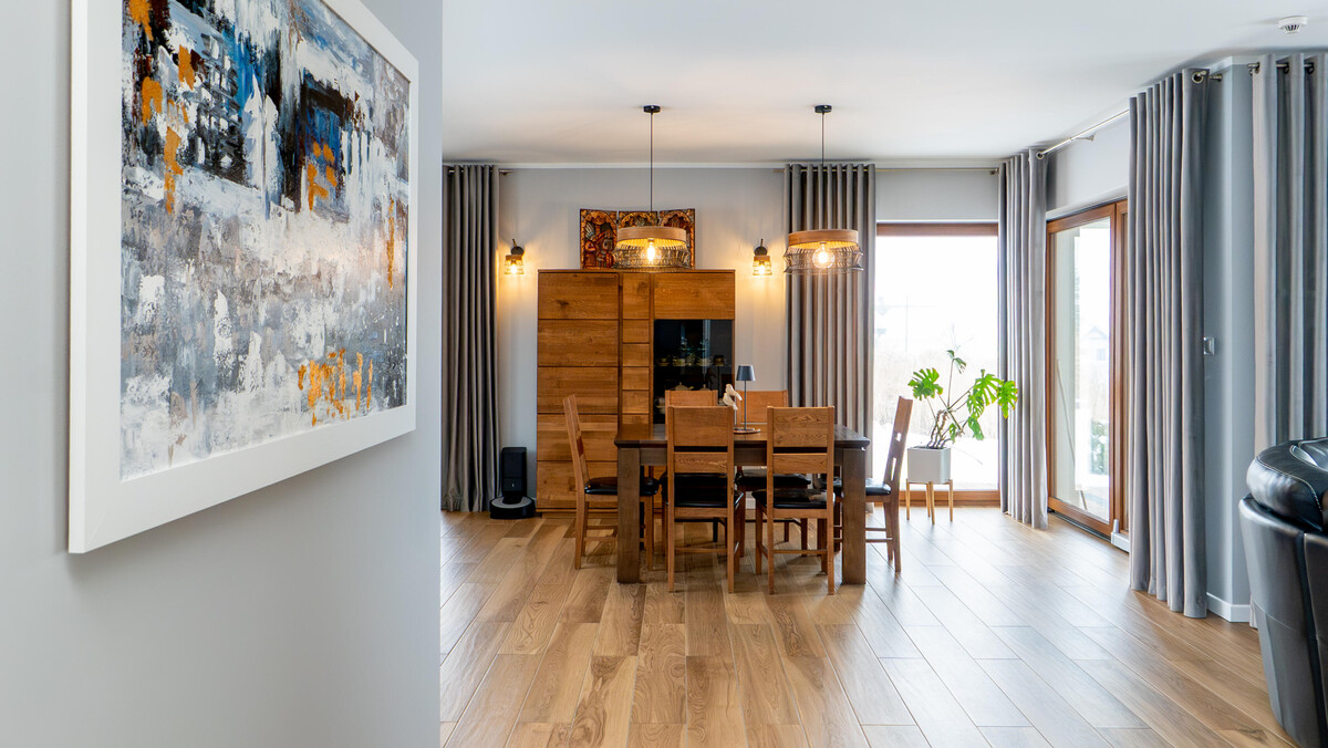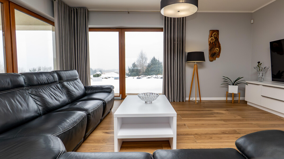 Salon z kominkiem i dużymi witrynami otwiera się na taras. Jesienią złoto liści, zimą biel śniegu, latem soczysta zieleń – cały rok spektakl widoczny z kanapy. Kuchnia otwarta, przemyślana, z dużymi oknami nad blatem – tu śniadania smakują inaczej, a kolacje przeciągają się do późna. Duży stół czeka na rodzinę i przyjaciół