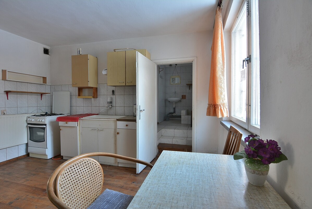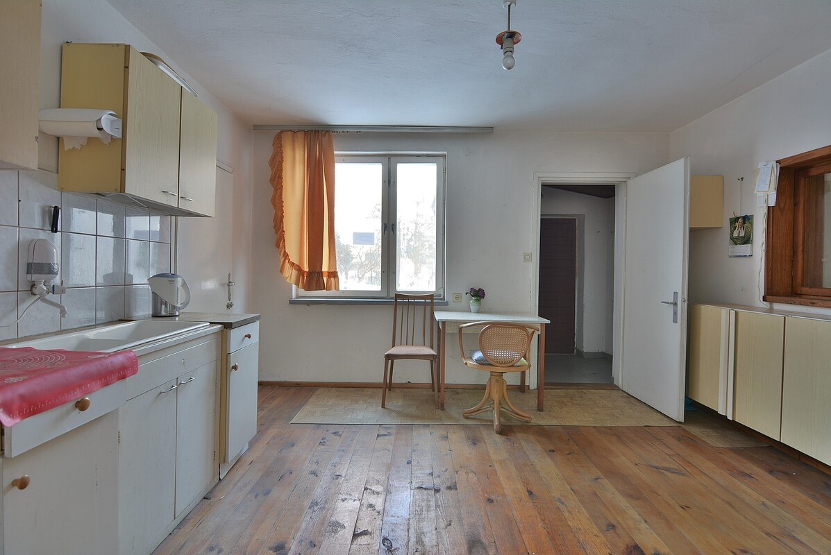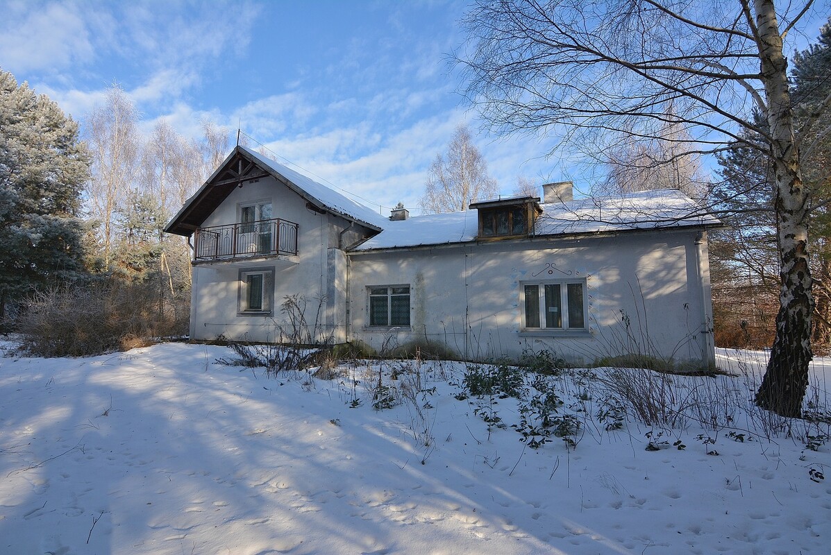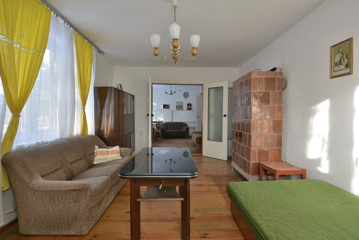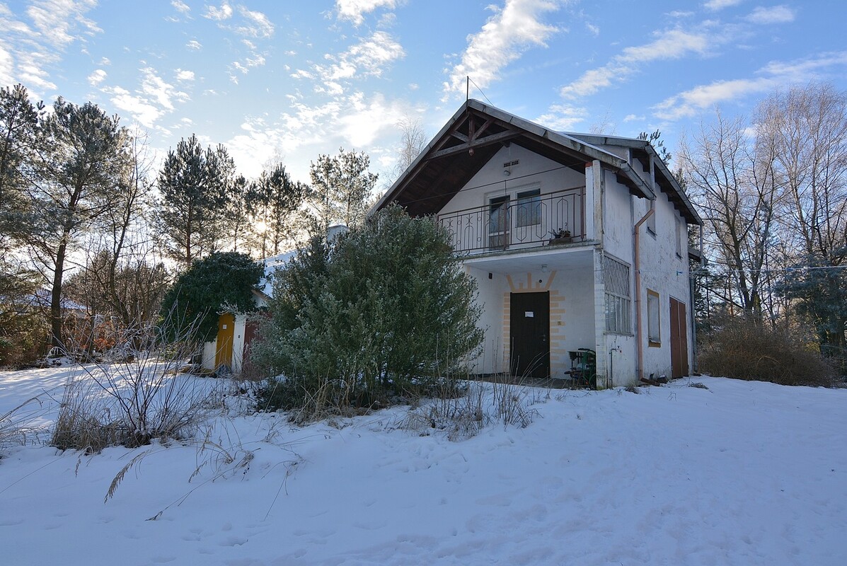 Piętrowy dom o powierzchni użytkowej ok.120 m2 w stanie do remontu. Posiada 3 niezależne wejścia, główne wejście prowadzi do holu, pozostałe 2 wejścia prowadzą przez oddzielne zamknięte ganki do kuchni i korytarza z trzecim pokojem. W dwóch pokojach zostały wymienione okna na PCV. W bryle domu znajduje się garaż o powierzchni ok.30 m2. Dom posiada duże poddasze z bezpośrednim wejściem z poziomu parteru, nadające się do aranżacji na pokój. Jest podpiwniczony na powierzchni połowy domu. Dach pokryty blachą. Ogrzewanie na piece kaflowe, odprowadzanie ścieków do szamba. Działka o powierzchni 2729 m2,bogata w drzewostan, częściowo ogrodzona, znajduje się na niej murowany garaż i drewniana szopa.