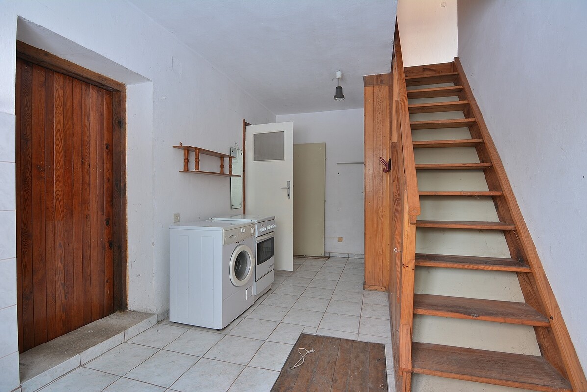 - duży hol z terakotą na podłodze i zejściem do dodatkowej niedużej piwnicy, znajduje się w nim WC z umywalką, jest też dodatkowa umywalka z przyłączem do pralki. Hol posiada wejście do garażu. - duża kuchnia z bezpośrednim wyjściem na zewnątrz domu przez zamknięty ganek.