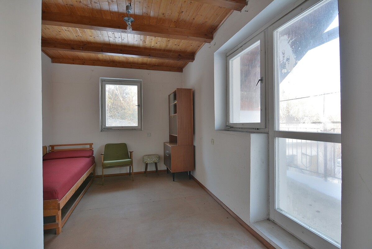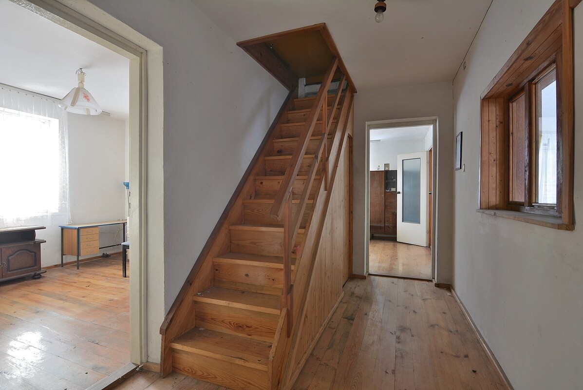 - trzeci oddzielny pokój, prowadzi do niego korytarz z wejściem do piwnicy i wyjściem na zewnątrz przez drugi zamknięty ganek, w korytarzu drewniane schody prowadzące na poddasze.