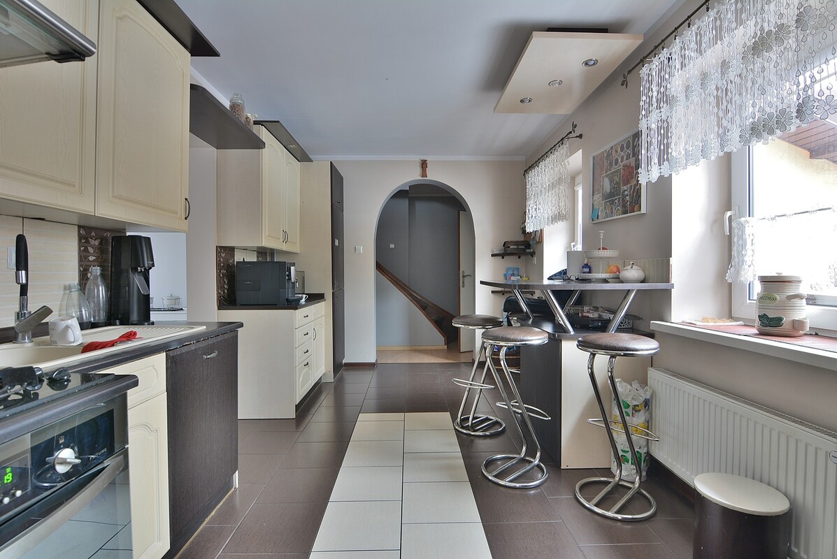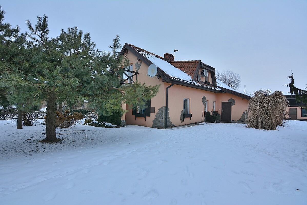 Piętrowy dom o powierzchni użytkowej 223 m2,po remoncie generalnym przeprowadzonym kilkanaście lat temu, z nową elewacją, wkładem kominowym i dachem. Składa się z dwóch niezależnych części, pierwszą część stanowi mieszkanie o powierzchni 128 m2,drugą mieszkanie o powierzchni 51 m2,biuro oraz dwa magazyny. Ogrzewanie domu nowym piecem na ekogroszek. Piętro pierwszego mieszkania wyposażone jest w klimatyzację z funkcją grzania. Dom jest częściowo podpiwniczony. Przed domem wyłożona jest kostka brukowa z ozdobnym ułożeniem. Działka o powierzchni 1810 m2 posiada dwa wjazdy i nowy płot metalowy od strony ulicy. Zagospodarowano ją licznymi nasadzeniami krzewów i drzewostanem, co dodaje jej uroku zwłaszcza w ciepłe dni, gdy wszystko jest zielone. Znajduje się na niej dwuczęściowa wiata z kamiennym grillem, gdzie można się zrelaksować i odpocząć, drewniana huśtawka, stojak na hamak i mini szklarnia, a także dwa budynki gospodarcze, w tym jeden murowany. Do domu doprowadzony jest Internet.