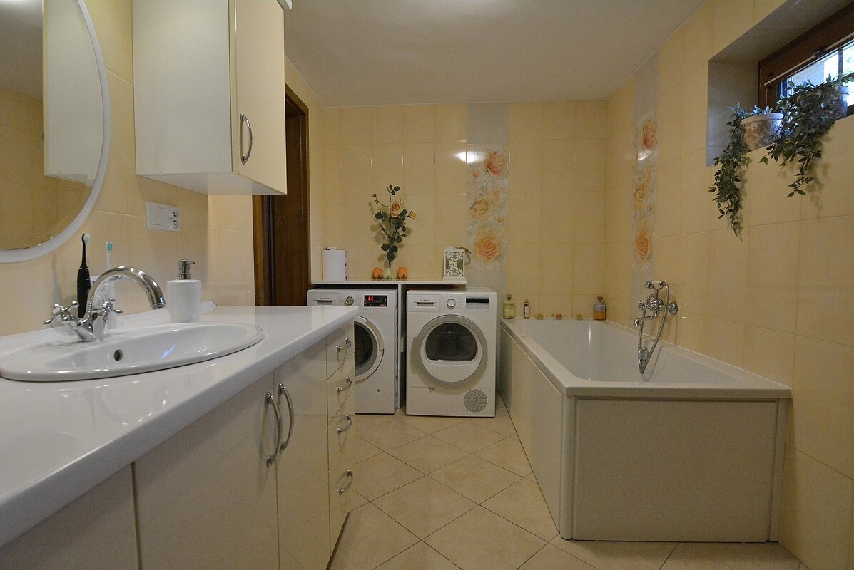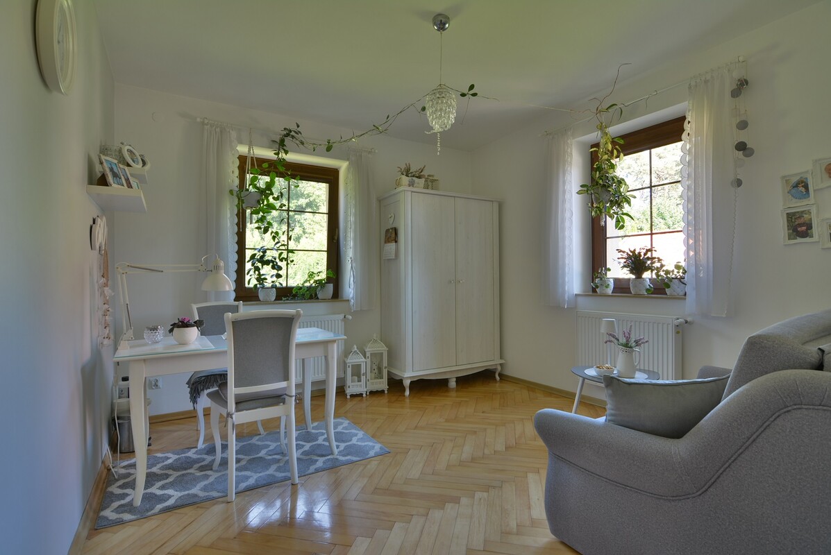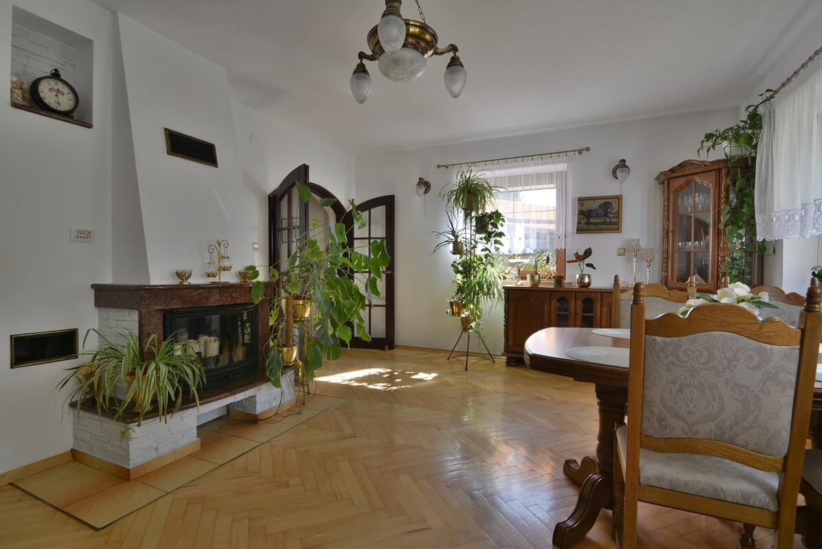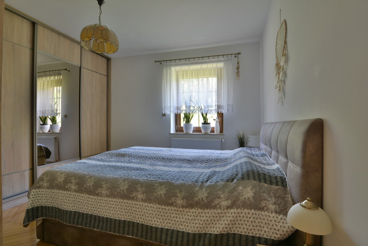 Parter: salon z kominkiem, 2 sypialnie, kuchnia, łazienka z wanną i prysznicem, osobne WC, spiżarnia, kotłownia. Kuchnia, łazienka i WC posiadają ogrzewanie podłogowe. Okna PCV antywłamaniowe, wzmacniane termicznie i wyposażone w rolety, okno w salonie dodatkowo z moskitierą wyposażoną w kasetę. Ekspozycja okien w salonie na południe, w jednej sypialni na północ, w drugiej na zachód. Poddasze: 3 pokoje, kuchnia z aneksem kuchennym oraz jadalnią, łazienka z WC. Poddasze posiada osobne wejście i jest wynajmowane w sezonie turystycznym dla wczasowiczów. Okna PCV z ekspozycją na wszystkie strony, wyposażone w rolety i moskitiery. Na podłogach we wszystkich pokojach domu parkiet drewniany. Kuchnie wyposażone w płyty indukcyjne do gotowania.