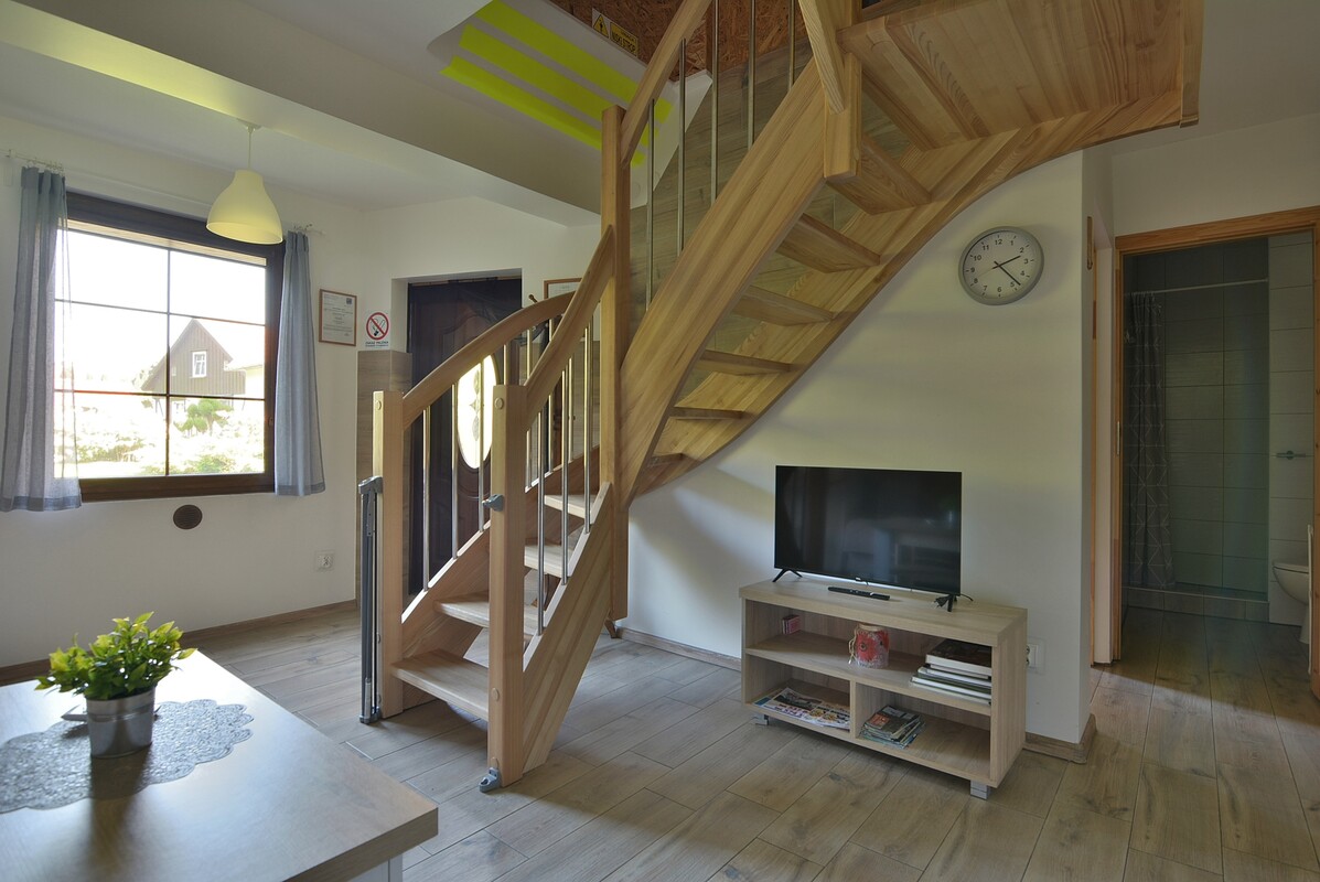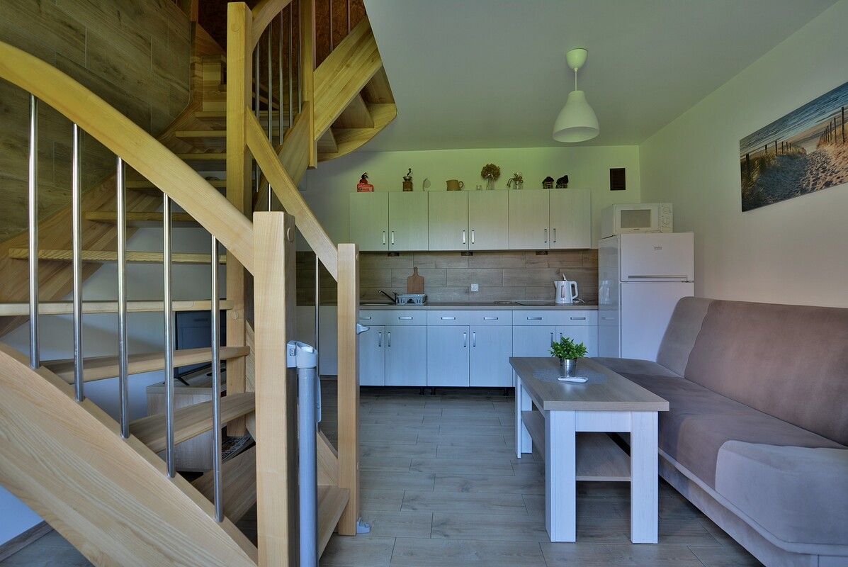 - Parter: salon z aneksem kuchennym, sypialnia, łazienka z WC i prysznicem.