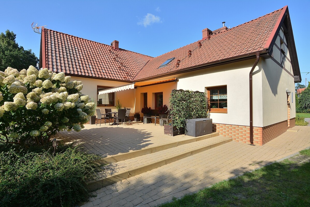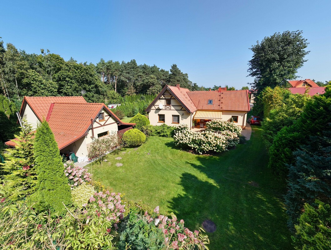 Budynek jest wolnostojącym domem o powierzchni użytkowej 111 m2 (po podłodze ok.130 m2). Posiada 2 kondygnacje, w tym górną stanowi poddasze. Nieruchomość w 2013 roku przeszła gruntowny remont. Wymieniono wówczas wszystkie instalacje, zastosowano dodatkowe ocieplenie elewacji. Budynek znajduje się na zagospodarowanej działce o powierzchni 1765 m2. Ogrzewanie domu na piec olejowy, dodatkowo można korzystać z pieca elektrycznego lub kominka z płaszczem wodnym rozprowadzonym na wszystkie pomieszczenia. Woda z sieci miejskiej, odprowadzanie ścieków do trzykomorowego szamba. Do budynku przylega duży taras w otoczeniu zadbanej zieleni z wejściem od strony kuchni. Na działce znajduje się studnia głębinowa z hydroforem oraz wiata grillowa otoczona zielenią. Parkowanie pojazdów na terenie posesji.