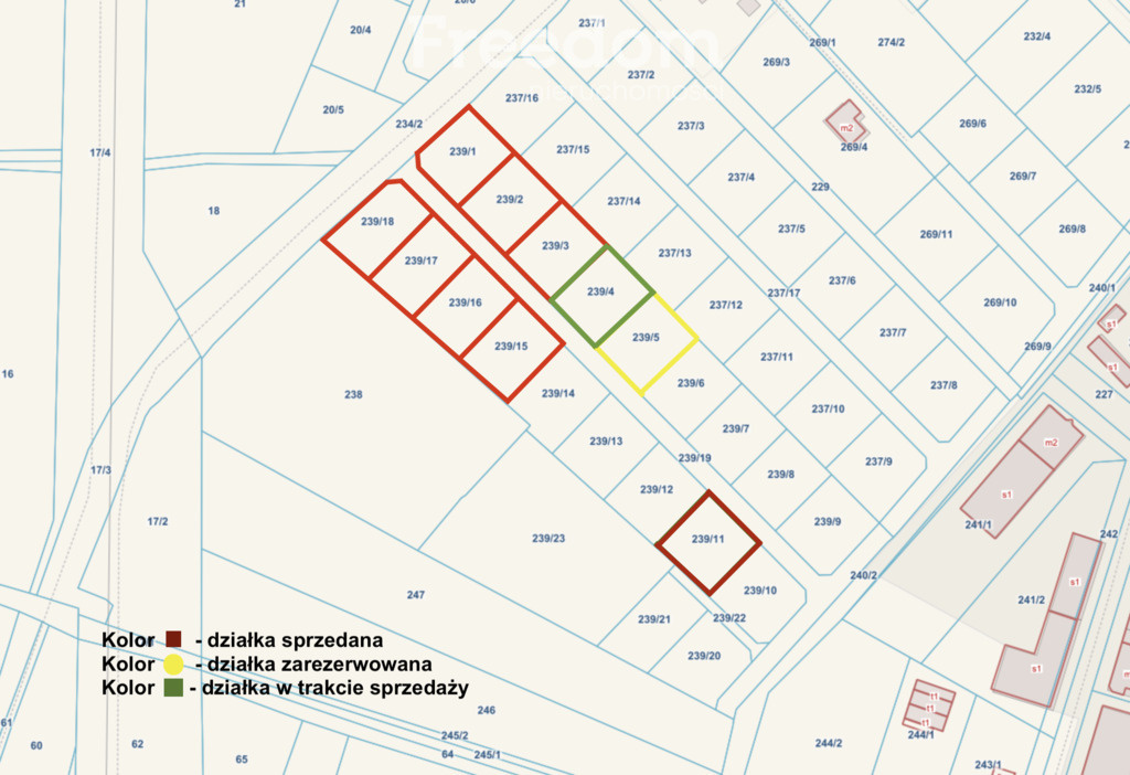 Kolorem CZERWONYM na mapie - oznaczono działki sprzedane,