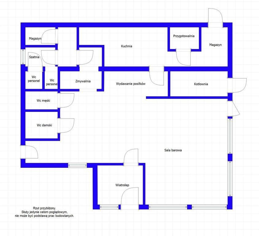 kompletny układ funkcjonalny (kuchnia, przygotowalnia, zmywalnia, miejsce na wydawanie posiłków, magazyny, toalety i ogromna sala barowa).