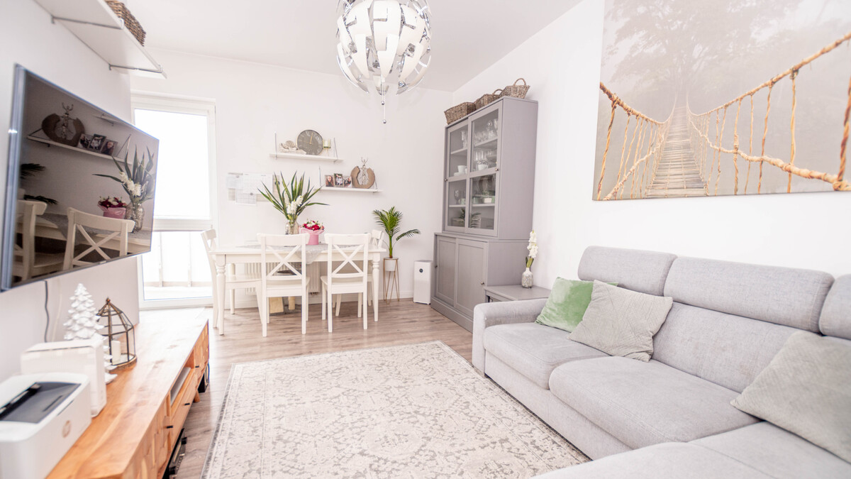 Mieszkanie składa się z przestronnego salonu z aneksem kuchennym i wyjściem na duży balkon, ustawnej sypialni, łazienki z WC oraz funkcjonalnego przedpokoju. Układ pomieszczeń zapewnia wygodę codziennego użytkowania i dobrą organizację przestrzeni.