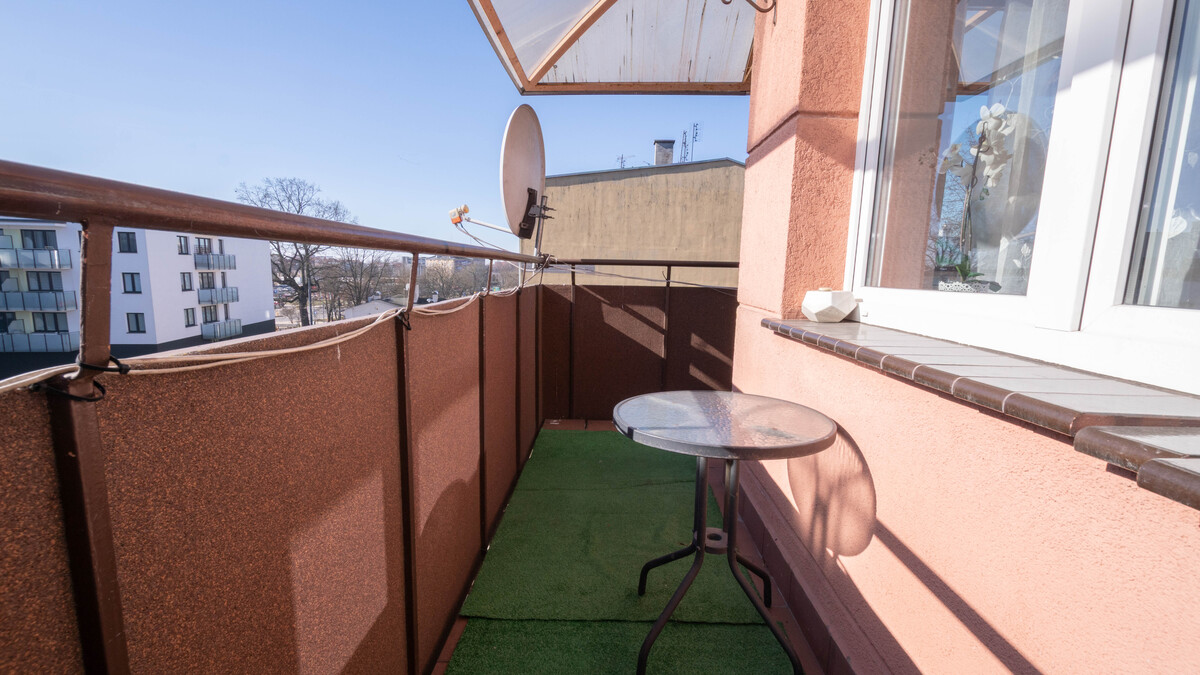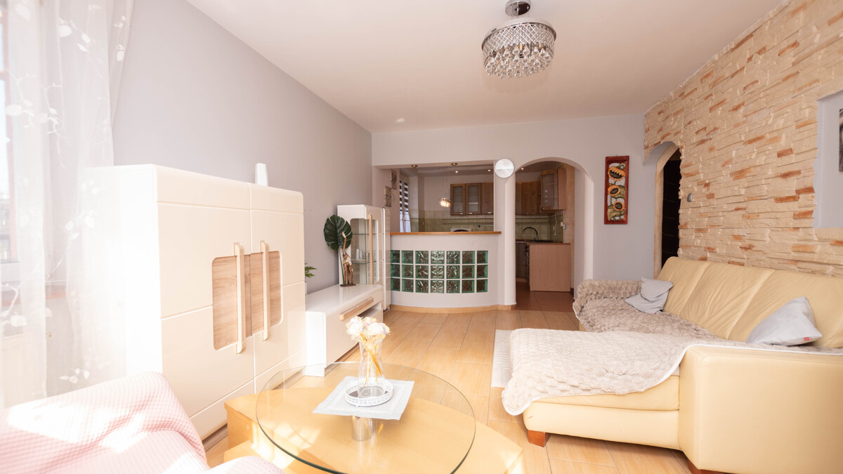Lokal składa się z dużego salonu z wyjściem na narożny balkon od strony południowo-zachodniej, sypialni, otwartej częściowo kuchni na salon, łazienki, wc oraz przedpokoju. Mieszkanie do ewentualnego odświeżenia. Możliwość pozostawienia umeblowania i sprzętu AGD widocznego na zdjęciach.