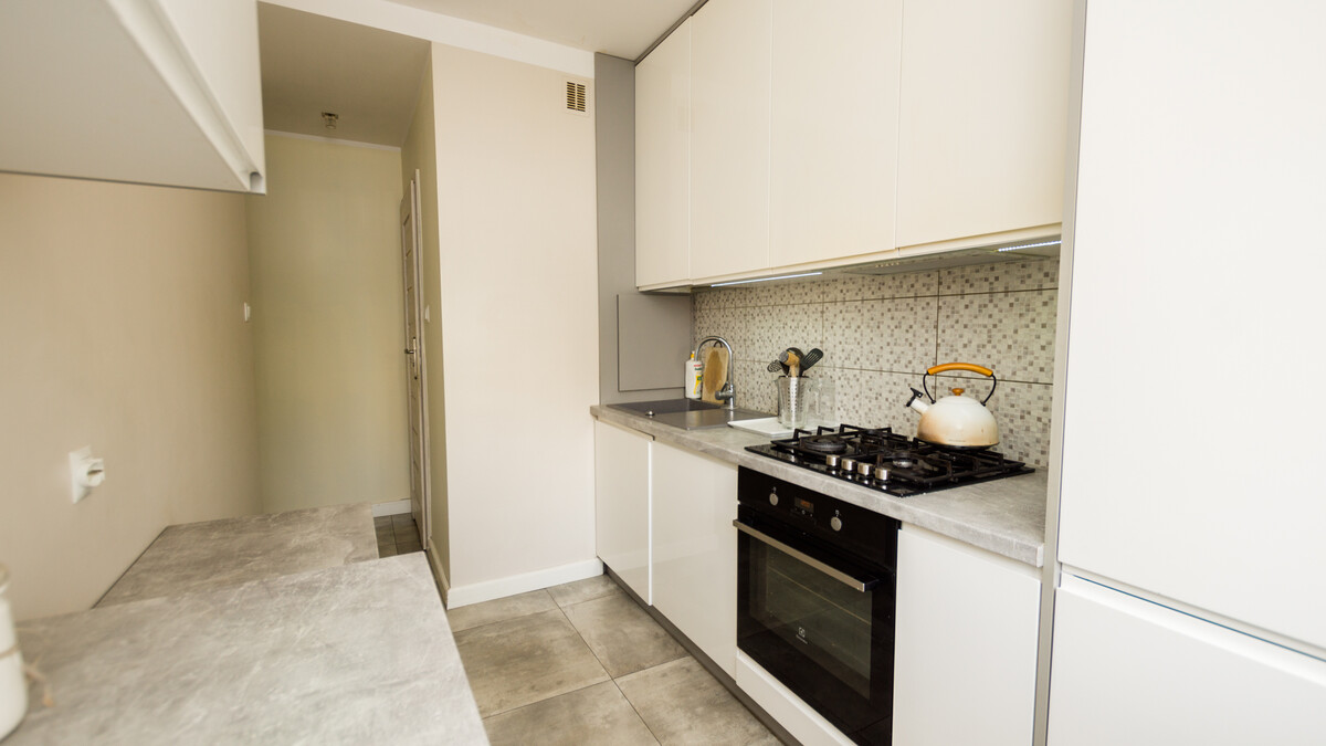 Kuchnia wyposażona w meble oraz sprzęt AGD taki jak lodówka, zmywarka, piekarnik.