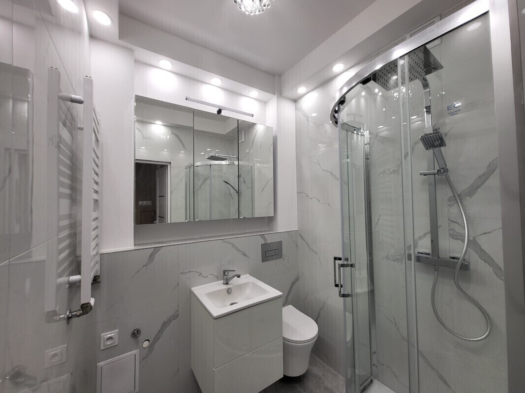 * Łazienka z kabiną prysznicową.
