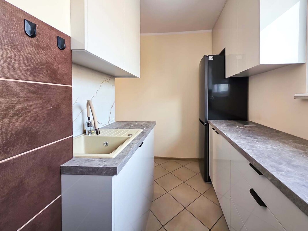 Nowoczesna zabudowa kuchni została zaprojektowana z myślą o wygodzie i funkcjonalności. Wyposażona jest w pełny zestaw sprzętów AGD, co pozwala na komfortowe użytkowanie od pierwszego dnia. Przemyślany układ szafek zapewnia dużo miejsca do przechowywania, a estetyczne wykończenie nadaje wnętrzu elegancki i świeży charakter.