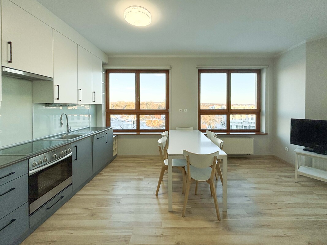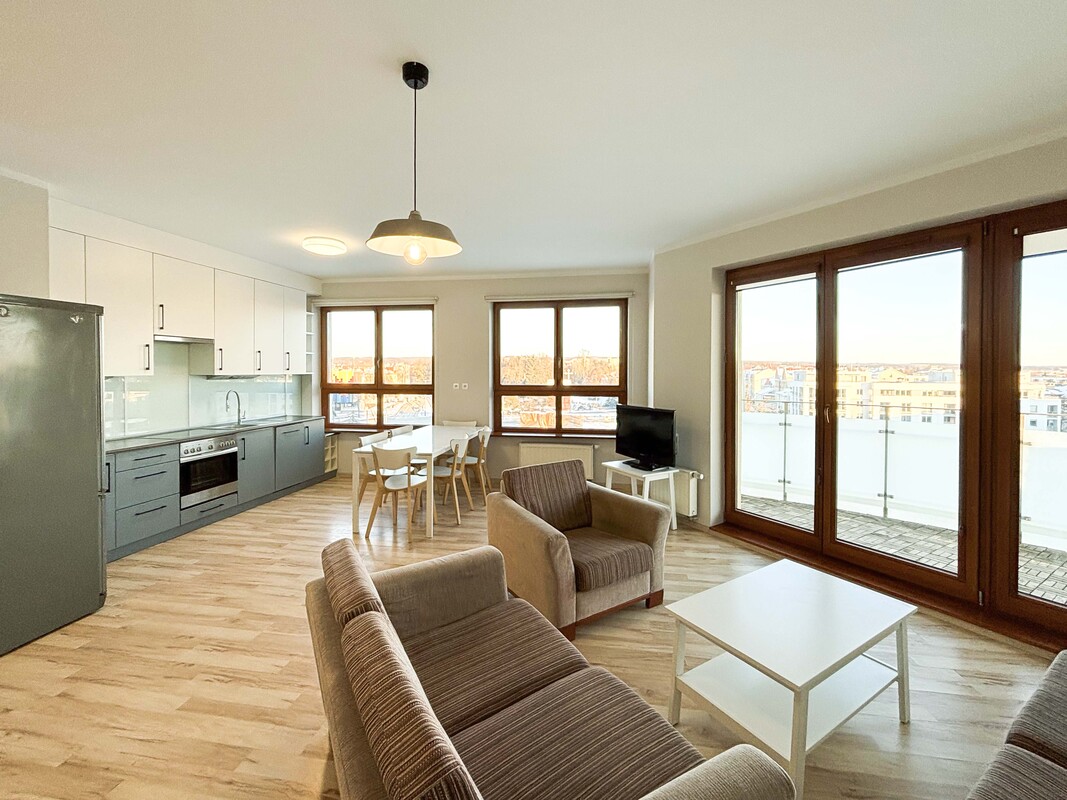 Oferujemy do wynajmu przestronne, 3-pokojowe mieszkanie o wysokim standardzie, o powierzchni 80 m2,usytuowane na 6.piętrze nowoczesnego budynku z windą. Apartament składa się z jasnego salonu z wyjściem na taras, funkcjonalnego aneksu kuchennego, dwóch komfortowych sypialni, łazienki oraz osobnej toalety. Wnętrze zostało estetycznie i starannie wykończone, z dużą dbałością o komfort przyszłych najemców. Mieszkanie jest w pełni wyposażone w sprzęt AGD, m. in. lodówkę, kuchenkę, zmywarkę oraz pralkę. Dodatkowym atutem jest komórka lokatorska znajdująca się na klatce schodowej oraz miejsce parkingowe w garażu podziemnym, udostępnione do wyłącznej dyspozycji najemcy.