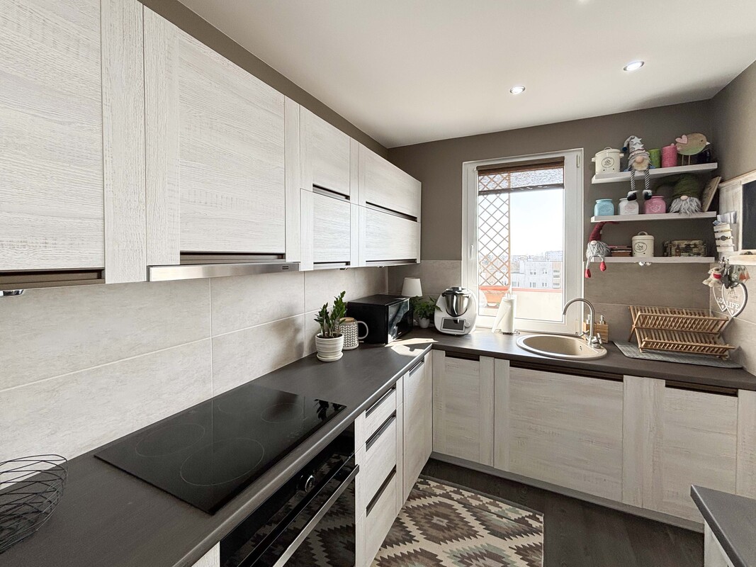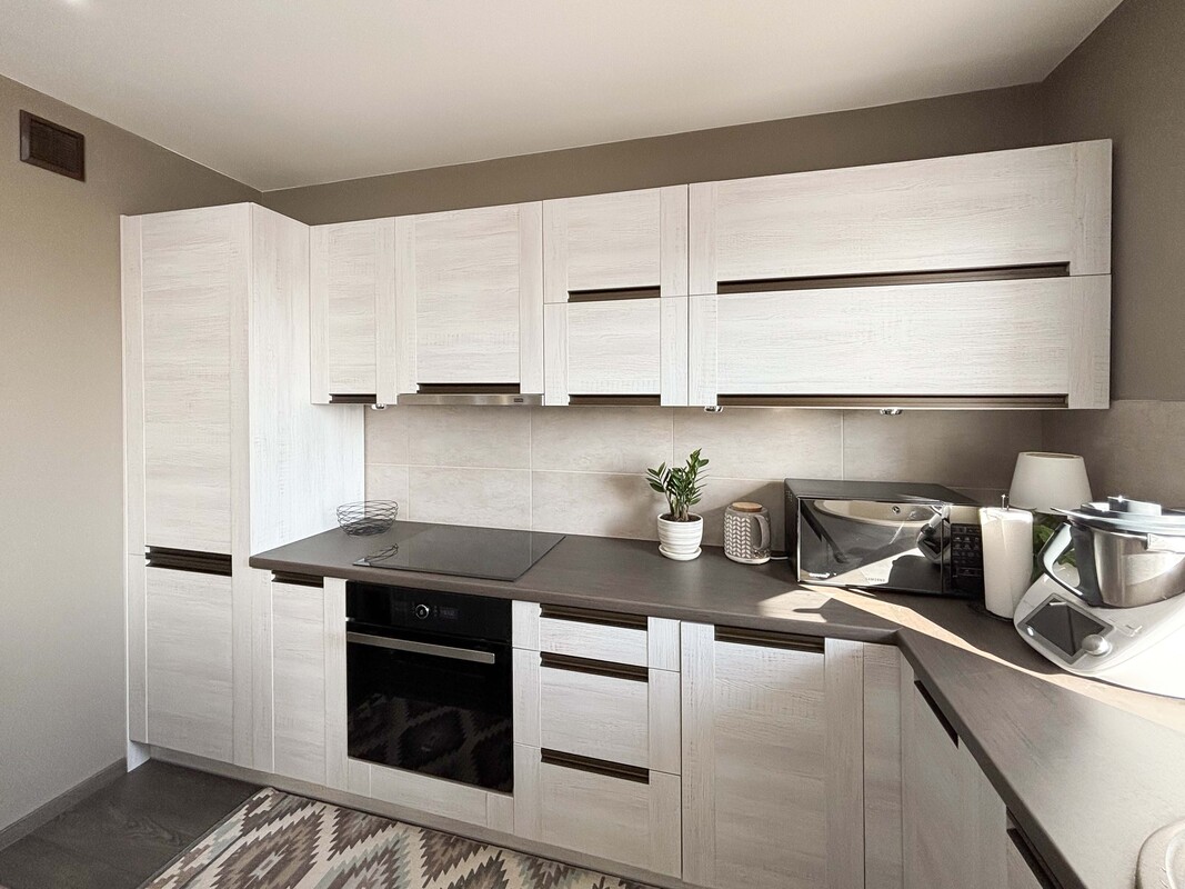 Centralnym punktem mieszkania jest przestronny salon z aneksem kuchennym, który tworzy komfortową i otwartą strefę dzienną. Kuchnia została wyposażona w estetyczną zabudowę meblową wraz z wyspą kuchenną, która stanowi zarówno wygodne miejsce do przygotowywania posiłków, jak i przestrzeń sprzyjającą wspólnemu spędzaniu czasu. Dla osób preferujących klasyczny układ mieszkania istnieje możliwość przywrócenia pierwotnego rozkładu i wydzielenia oddzielnej kuchni.