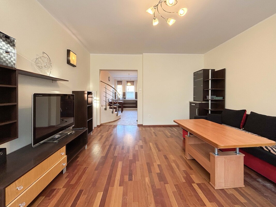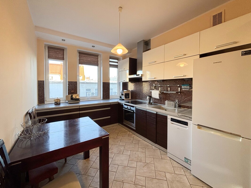 Przestronne, dwupoziomowe mieszkanie o powierzchni 93,15 m², położone na I piętrze budynku. Lokal składa się z dużej kuchni z oknami, w pełni wyposażonej zabudowy kuchennej (w tym ekspresu do kawy), przestronnego salonu, przedpokoju, dwóch dużych sypialni – w tym jednej z balkonem – oraz łazienki. Mieszkanie jest dwustronne, bardzo dobrze doświetlone i słoneczne, co znacząco podnosi komfort codziennego użytkowania. Funkcjonalny układ pomieszczeń oraz duża powierzchnia sprawiają, że jest to idealna propozycja dla rodziny lub osób poszukujących przestronnego mieszkania. Ogrzewanie miejskie zapewnia wygodę oraz stabilność kosztów eksploatacyjnych.
