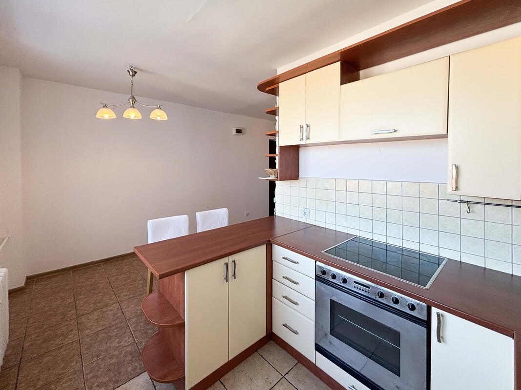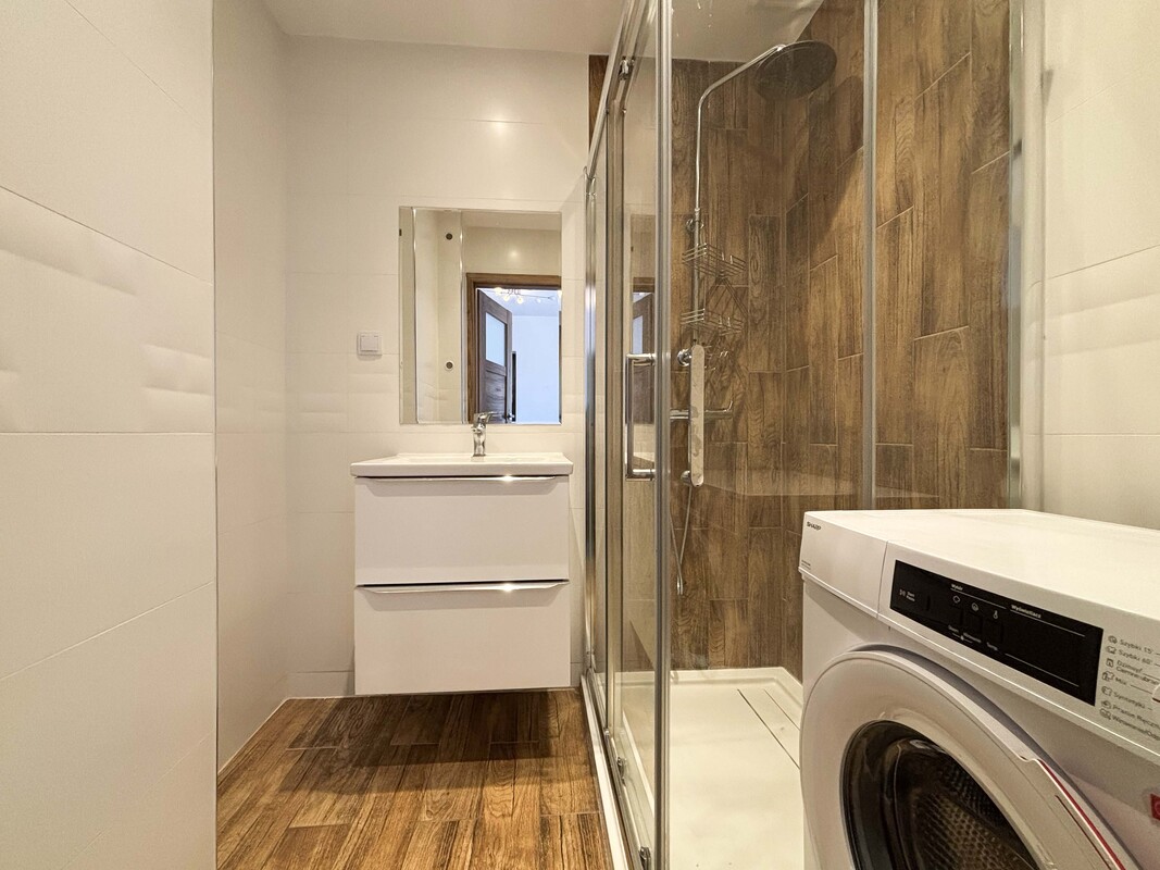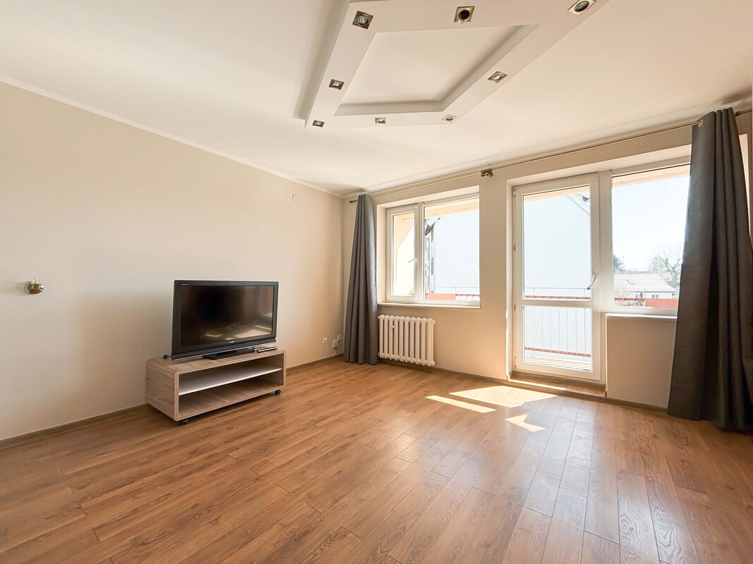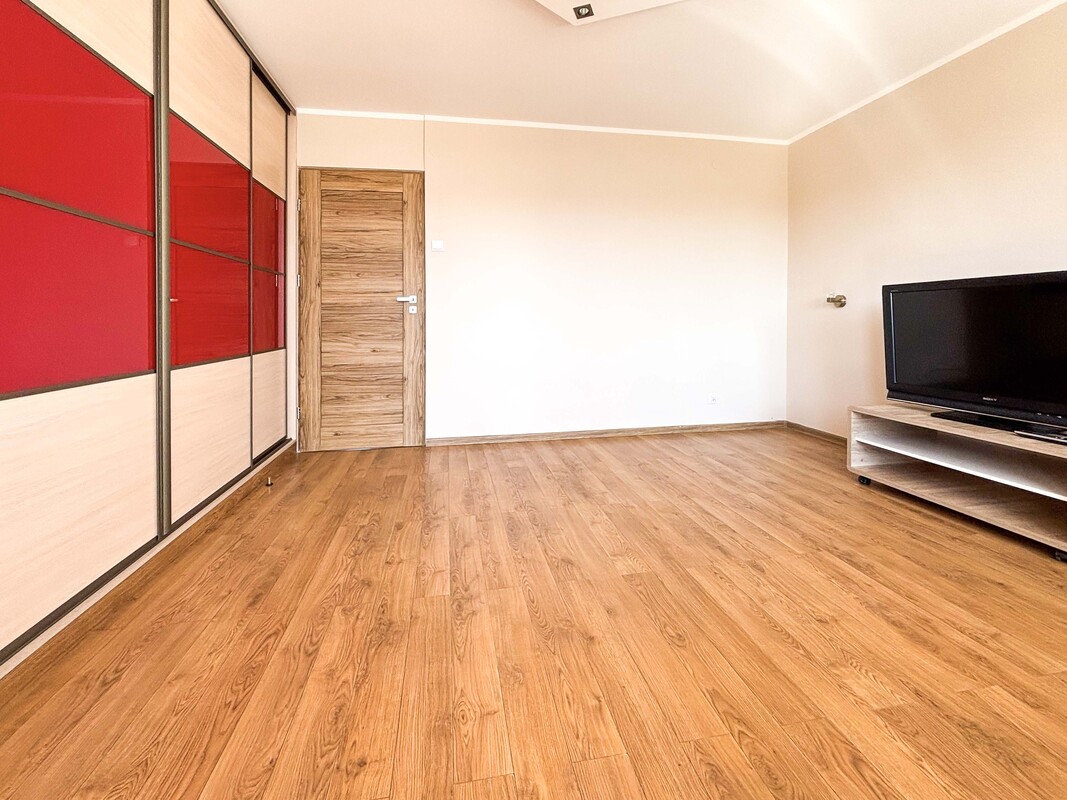 Oba pomieszczenia są częściowo umeblowane – w sypialni znajduje się duże łóżko, natomiast salon wyposażony jest w zabudowę szafy, szafkę pod telewizor oraz telewizor. Kuchnia jest otwarta na jadalnię i wyposażona w meble oraz sprzęt AGD. Łazienka oraz oddzielne WC przeszły kapitalny remont. Całość mieszkania została odświeżona i jest gotowa do wprowadzenia. Na życzenie najemcy właściciel może doposażyć lokal w lodówkę.