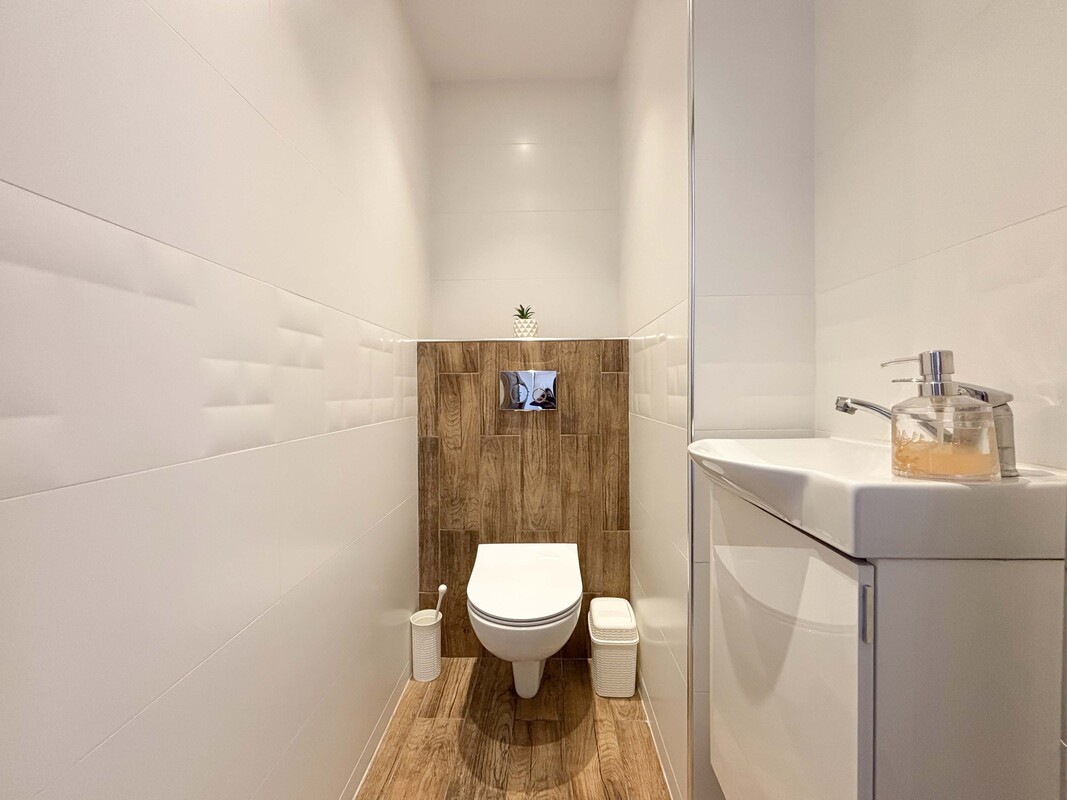 Oba pomieszczenia są częściowo umeblowane – w sypialni znajduje się duże łóżko, natomiast salon wyposażony jest w zabudowę szafy, szafkę pod telewizor oraz telewizor. Kuchnia jest otwarta na jadalnię i wyposażona w meble oraz sprzęt AGD. Łazienka oraz oddzielne WC przeszły kapitalny remont. Całość mieszkania została odświeżona i jest gotowa do wprowadzenia. Na życzenie najemcy właściciel może doposażyć lokal w lodówkę.