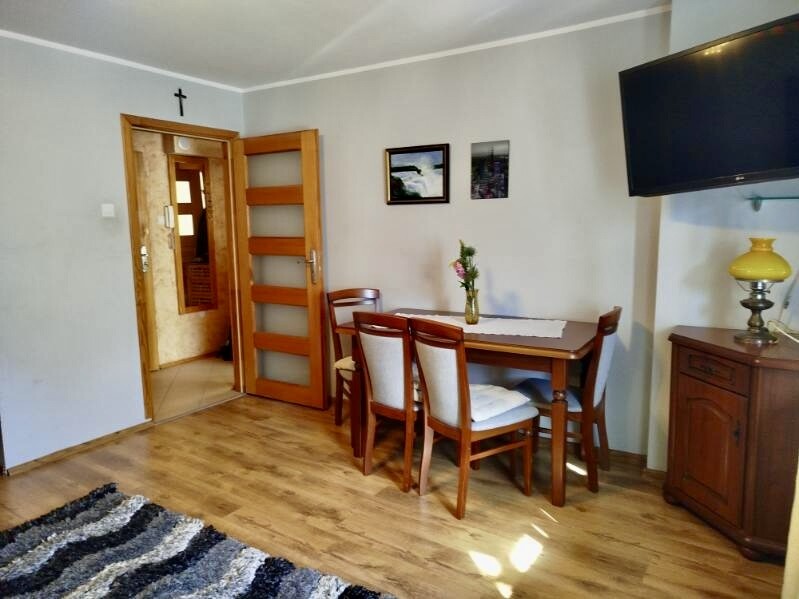 Lokal o powierzchni 38 m² znajduje się na II piętrze i składa się z pokoju, kuchni, łazienki z WC oraz przedpokoju. Mieszkanie jest w pełni umeblowane – wyposażone w pralkę, lodówkę, mikrofalówkę i telewizor. W przedpokoju znajduje się szafa w zabudowie. Ogrzewanie centralne.