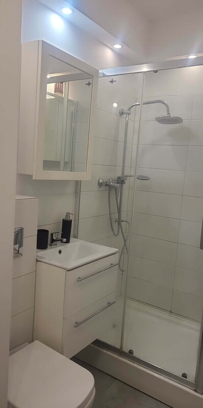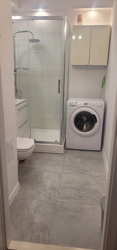 ✔️ łazienka z prysznicem, WC, lustrem, dwiema szafkami i pralką