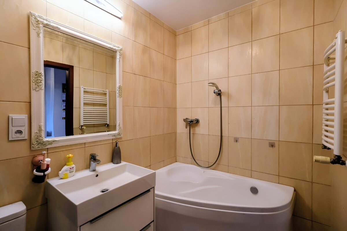 - Łazienka z wanną, pralką, umywalką i eleganckim lustrem