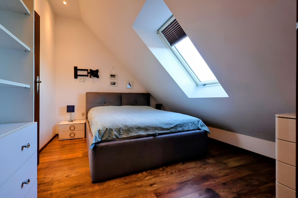 - Duża sypialnia z pojemną szafą w zabudowie