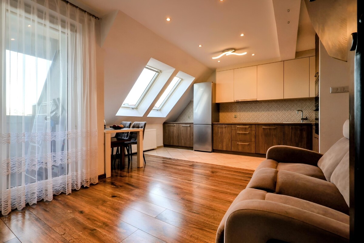 - Przestronny salon z aneksem kuchennym i wyjściem na balkon