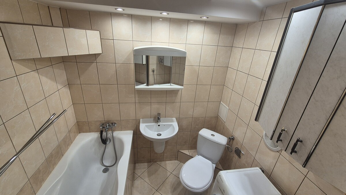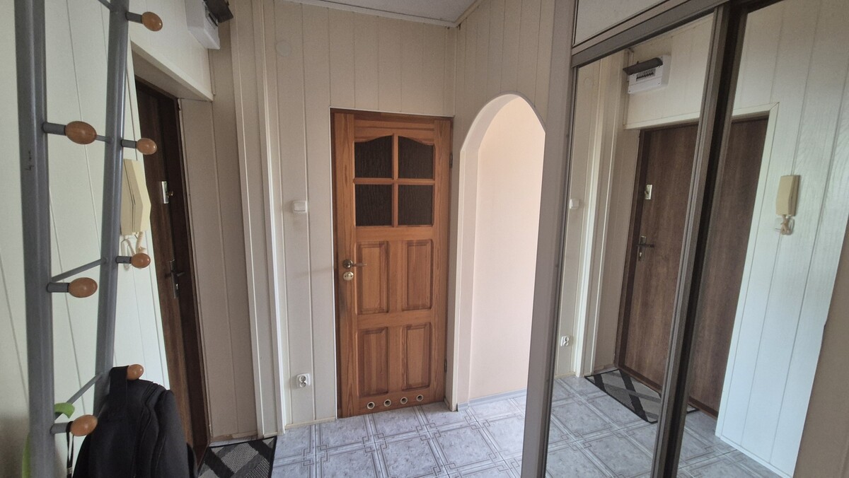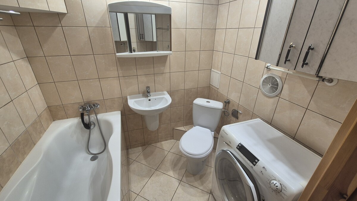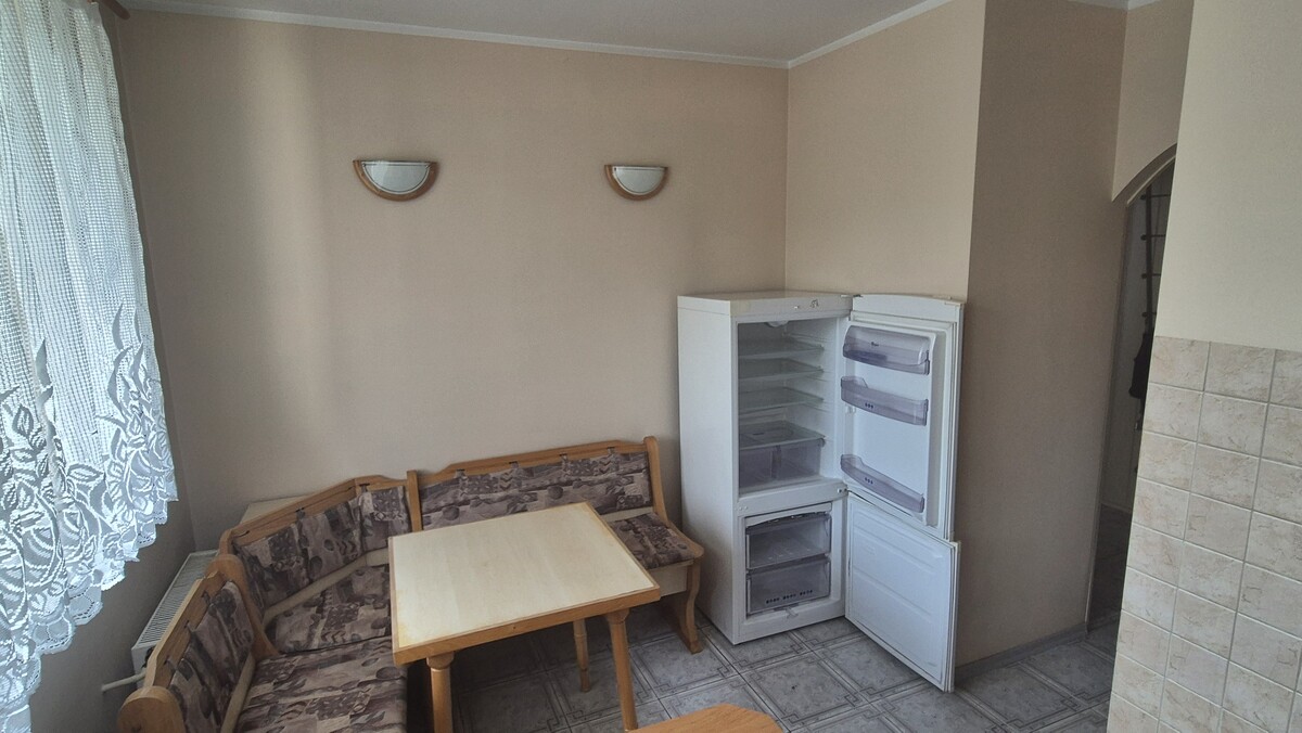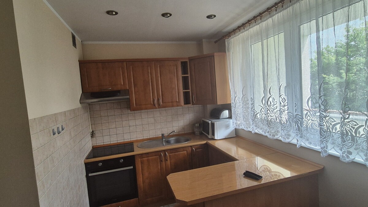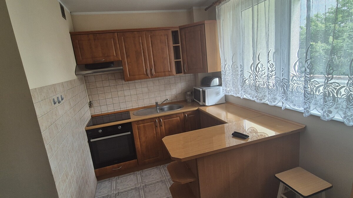 Przedmiotowa nieruchomość składa się z ustawnego pokoju ok 24 m2 z wystawą południową z wyjściem na zadaszony duży balkon z wystawą południową z dużej jasnej kuchni ok 11 m2, która wyposażona jest w niezbędny sprzęt AGD tj. piekarnik, płyta indukcyjna, lodówka, mikrofala, okap kuchenny oraz z łazienki z wc, wanną i pralką. Powierzchnia przedpokoju została wykorzystana do maksimum poprzez wbudowaną szafę na wymiar. Pokój wyposażony w komody BRW, wersalkę, telewizor. Na wyposażeniu znajduje się także żelazko, deska do prasowania, suszarka i odkurzacz.