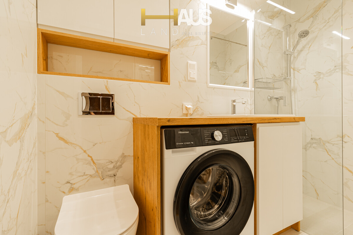 Łazienka ma elegancki i nowoczesny charakter - wykończona w ponadczasowej stylistyce, wyposażona w wygodny prysznic oraz praktyczne rozwiązania do przechowywania. Całość tworzy spójną i estetyczną przestrzeń sprzyjającą codziennemu komfortowi.