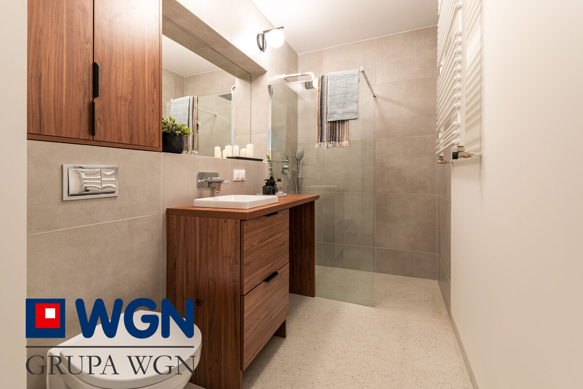 Łazienka z WC o wielkości ok 5 m2, a w niej wygodny prysznic typu walk-in.