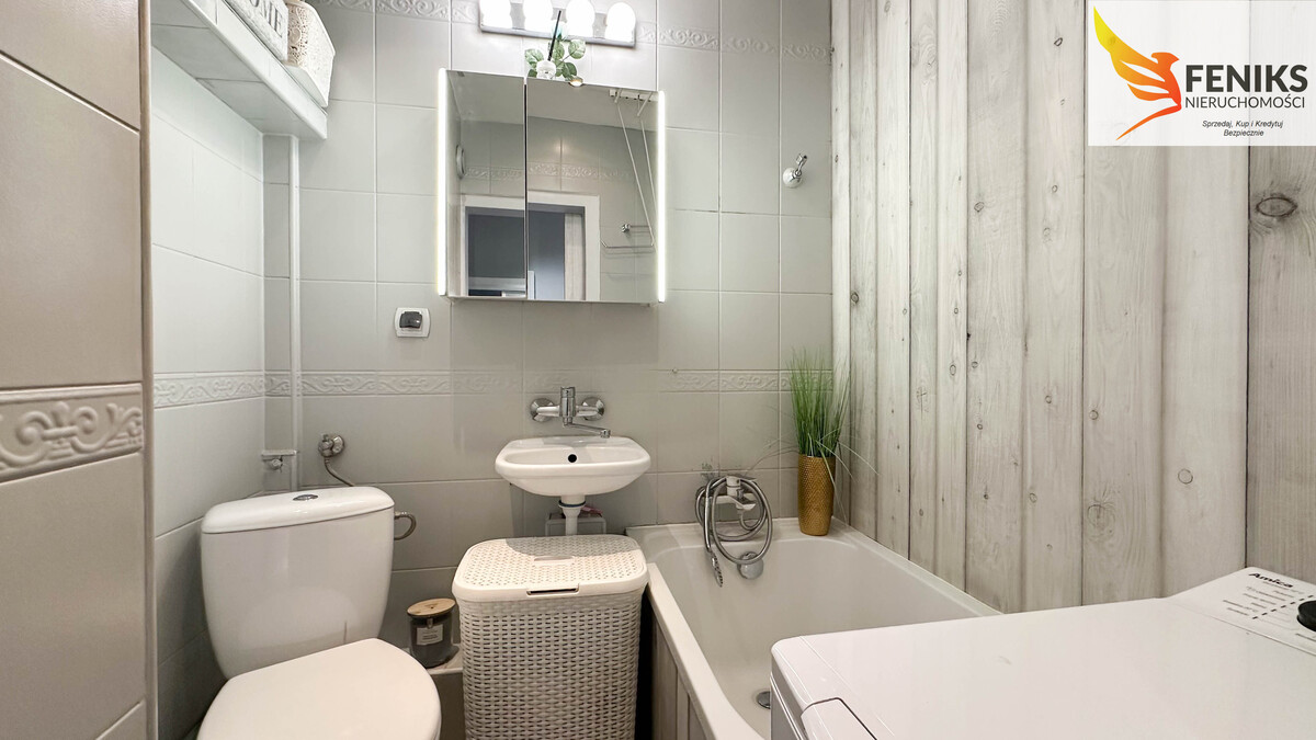 Lokal składa się z pokoju z aneksem kuchennym, sypialni, łazienki z wanną oraz przedpokoju, do mieszkania przynależy piwnica. Mieszkanie po remoncie, nowocześnie urządzone gotowe do wprowadzenia. Wystawa okien w kierunku zachodnim co czyni je dobrze doświetlonym od południa do zachodu słońca. Mieszkanie kompaktowe idealne dla małej rodziny, pary lub singla. Wyposażenie do uzgodnienia z właścicielem.