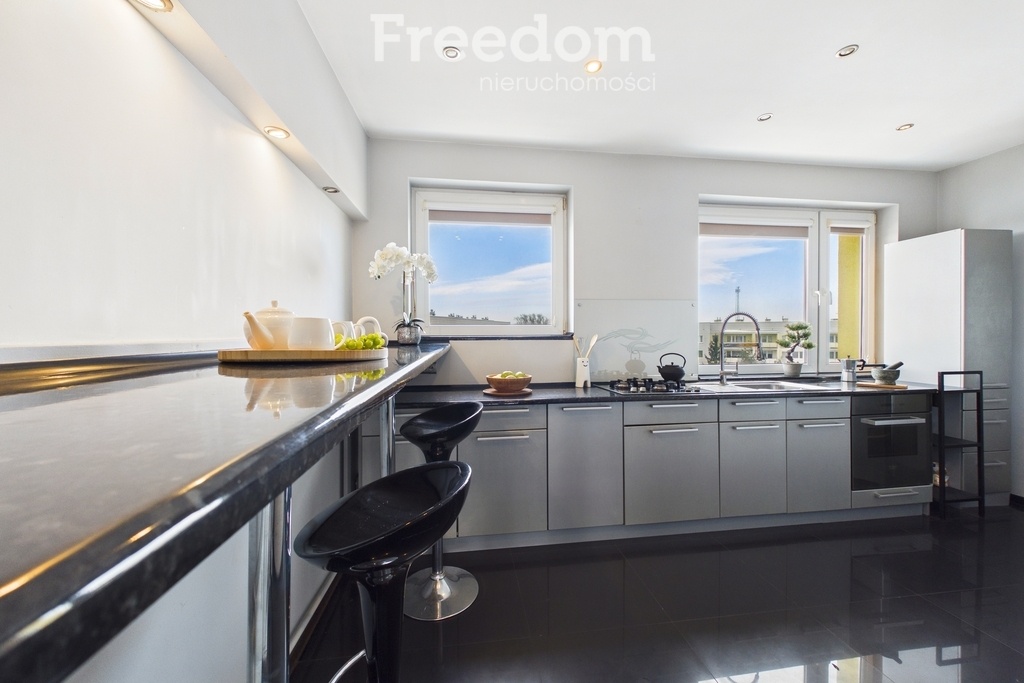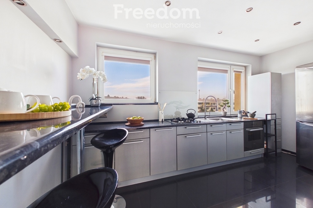 Kuchnia otwarta na strefę dzienną została zaprojektowana z prawdziwą dbałością o szczegóły i najwyższą jakość wykonania. Dominują tu eleganckie, szare fronty, które tworzą czysty, minimalistyczny wygląd. Ciemny, lakierowany blat ciągnie się długą, wygodną linią roboczą. Całość zapewnia mnóstwo miejsca do przygotowywania posiłków i swobodnego poruszania się. Dwa duże okna sprawiają, że kuchnia jest wyjątkowo jasna przez większość dnia. Naturalne światło wpada tu od rana aż po ciepłe, popołudniowe zachody słońca, odbijając się od błyszczących powierzchni i nadając wnętrzu lekkości oraz przytulnego klimatu. Oświetlenie sufitowe w postaci licznych ciepłych LED-ów zapewnia doskonałą widoczność nawet wieczorem. Całość dopełnia czteropalnikowa płyta gazowa na szkle ceramicznym osadzona równo z blatem i głęboki, podblatowy zlewozmywak z wyciąganą baterią. W zabudowie kuchni jest również zamontowana pojemna zmywarka oraz piekarnik.