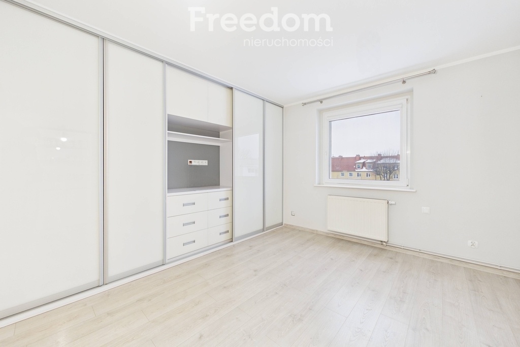 W salonie znajduje się stała zabudowa na jednej ze ścian oraz elegancka witryna. Sypialnia wyposażona jest w stałą zabudowę, łóżko oraz miękką wykładzinę, co tworzy przytulną przestrzeń do wypoczynku. W kuchni zabudowa kuchenna wraz ze zmywarką oraz płytą indukcyjną. Przedpokój z funkcjonalną zabudową typu Komandor.