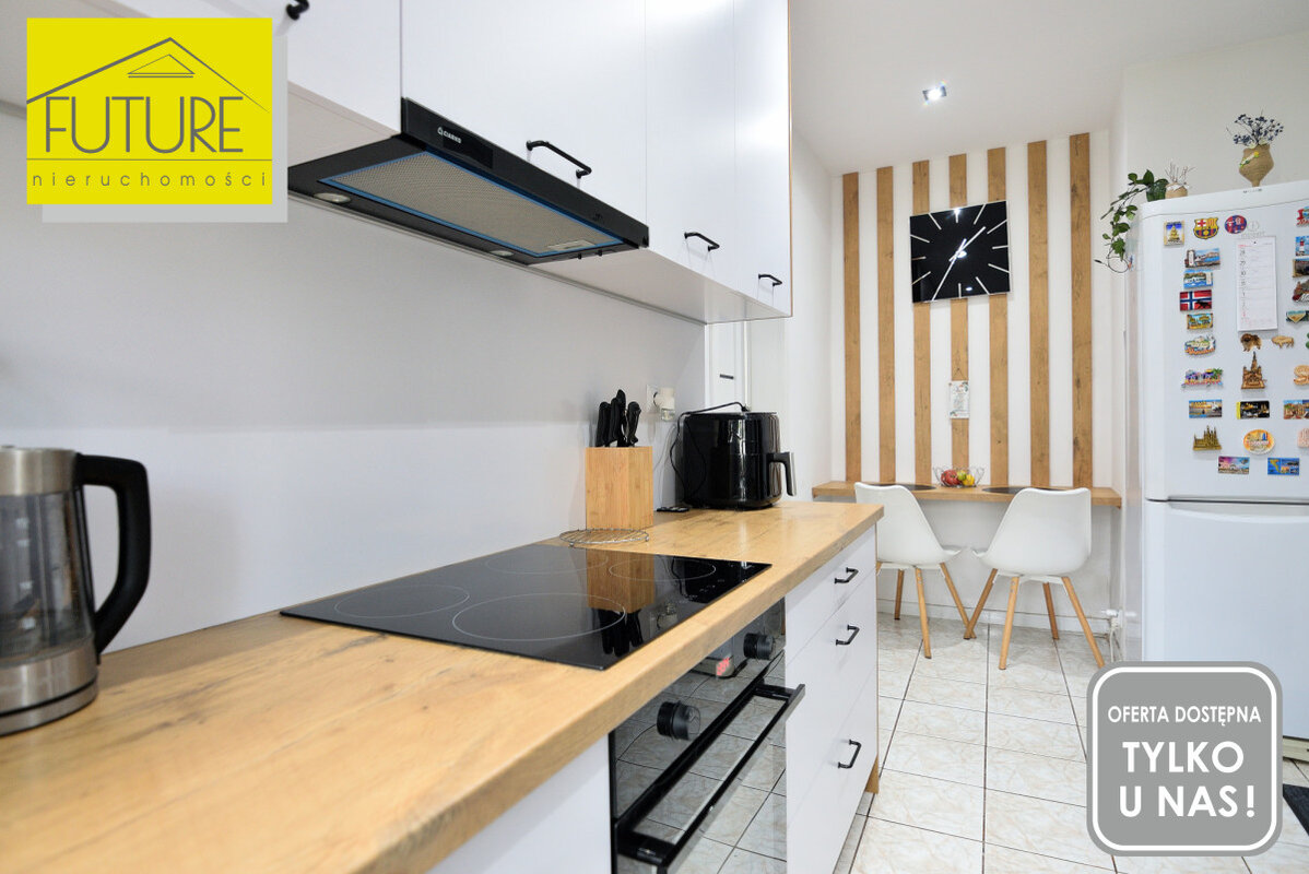 W cenie pozostaje zabudowa kuchni wraz z wyposażeniem (płyta indukcyjna, piekarnik elektryczny, okap, lodówka) wyposażenie łazienki (szafki, pralka) oraz szafa z małego pokoju - pozostałe meble do uzgodnienia.
