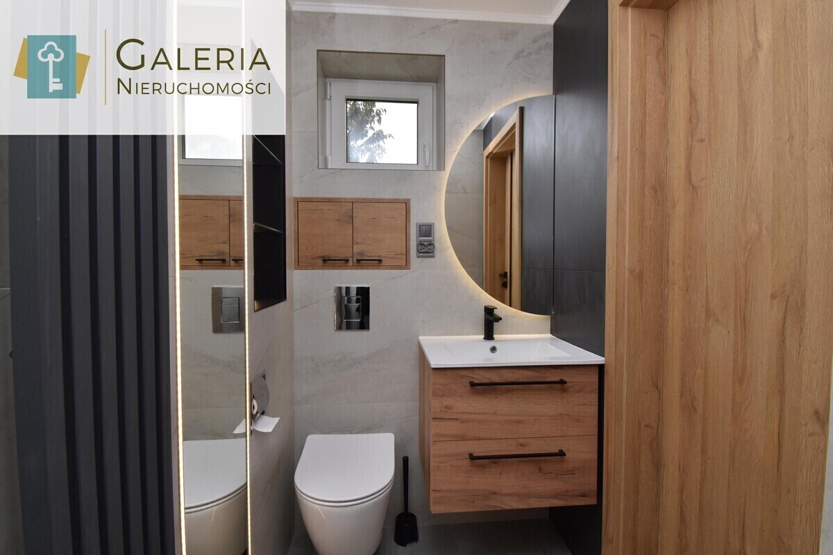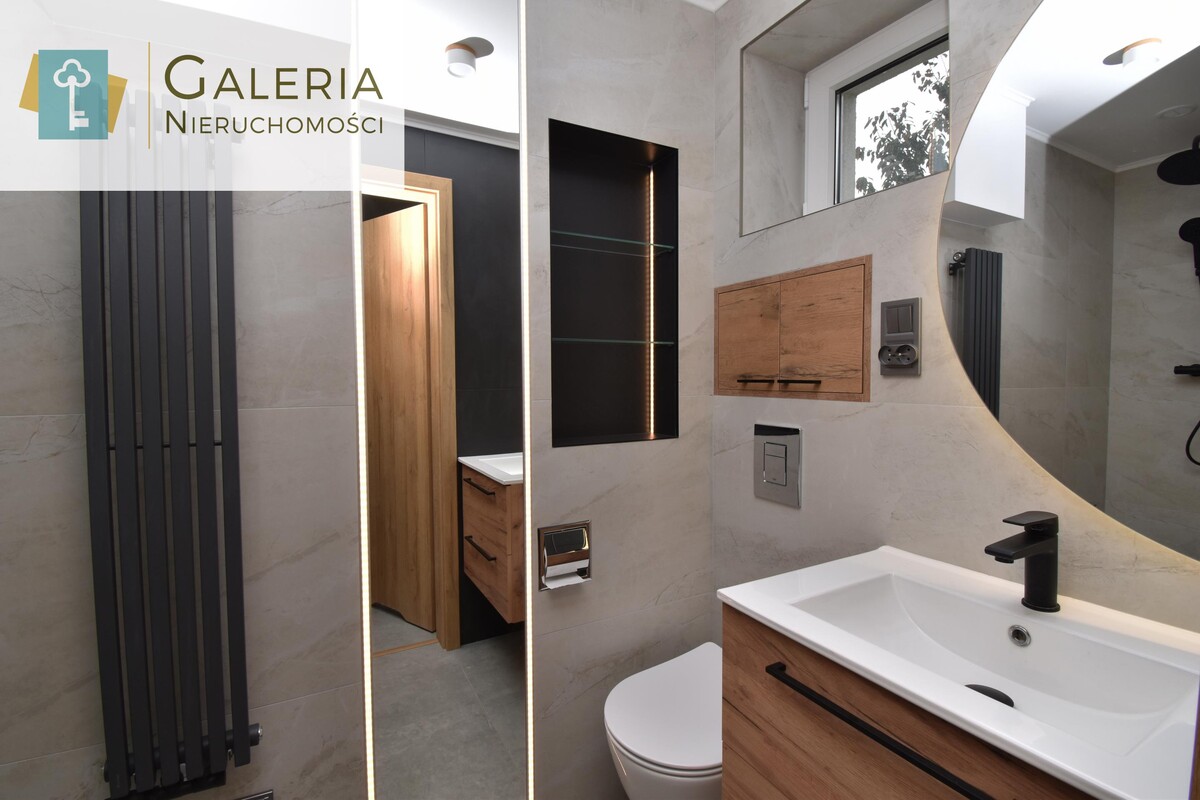 Jasna, nowoczesna i funkcjonalna. Znajduje się tu prysznic typu walk-in, WC, umywalka z szafką i duże lustro z podświetleniem LED. Dodatkowym atutem jest okno, które zapewnia naturalne światło i doskonałą wentylację. Aranżacja utrzymana w eleganckich barwach drewna, szarości i czerni.