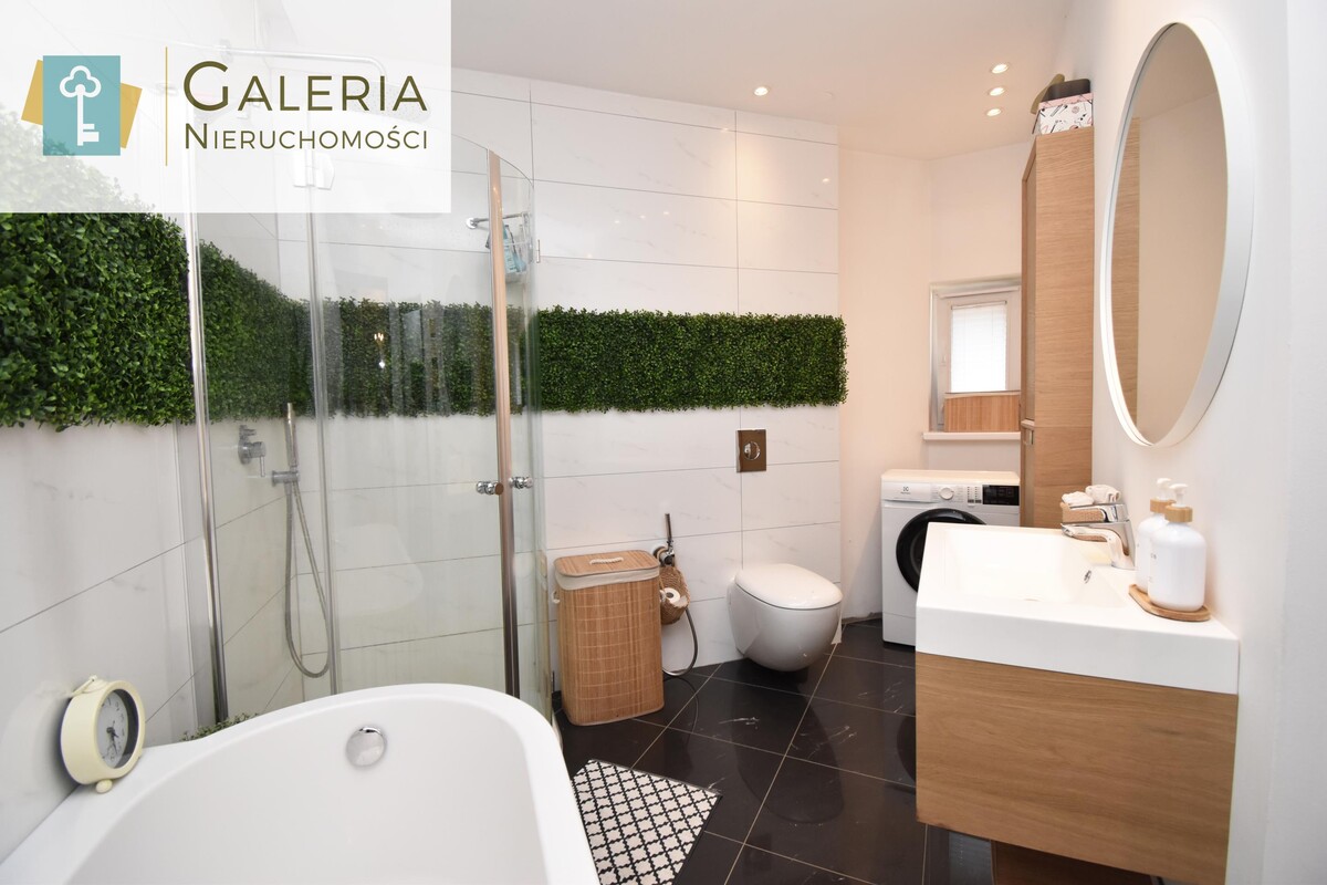 Łazienka z oknem została kompleksowo urządzona znajdziesz tu zarówno kabinę prysznicową, jak i wannę, a także WC i umywalkę. Szafki łazienkowe wykończone naturalnym fornirem dębowym dodają klasy i przytulności.