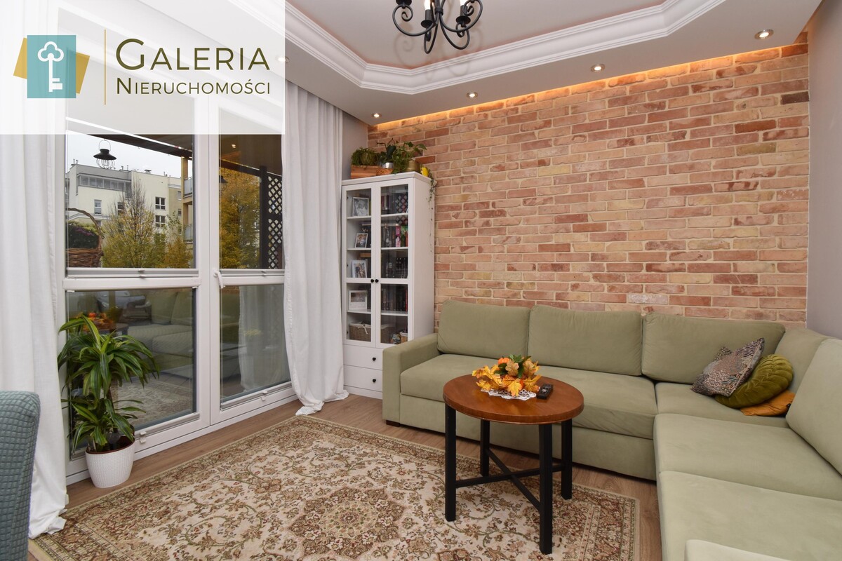 Ściana z prawdziwej, odzyskanej cegły nadaje pomieszczeniu wyjątkowego charakteru. W salonie znajduje się wygodny narożnik, który może pozostać dla nowych właścicieli, a przestrzeń pozwala również na komfortowe ustawienie stołu jadalnianego. Atutem są duże drzwi balkonowe, które doskonale doświetlają wnętrze.