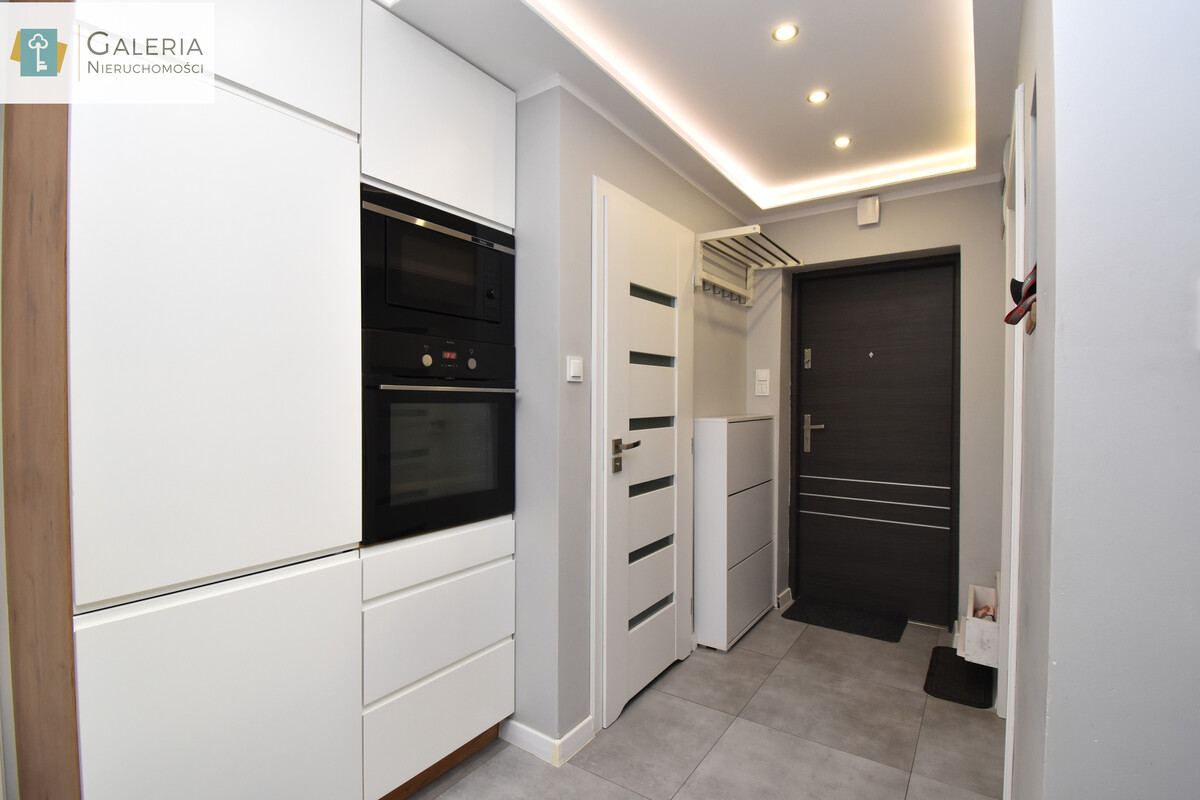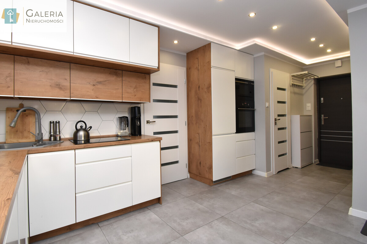 Sercem nieruchomości jest przestronny salon połączony z aneksem kuchennym idealne miejsce do odpoczynku i wspólnego spędzania czasu. Nowoczesna zabudowa kuchenna w modnej kolorystyce oferuje dużo miejsca do przechowywania i doskonale komponuje się z wnętrzem. W oddzielnej sypialni znajduje się pojemna szafa w zabudowie, która ułatwia organizację przestrzeni.