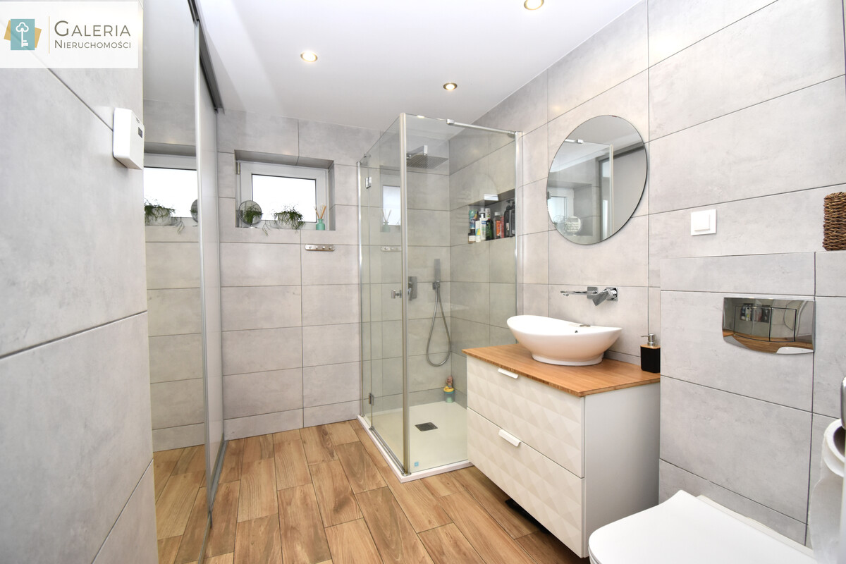 Łazienka została urządzona w nowoczesnym stylu z funkcjonalną zabudową, przestronnym prysznicem i jasnym wykończeniem, co sprawia, że jest łatwa w utrzymaniu czystości.