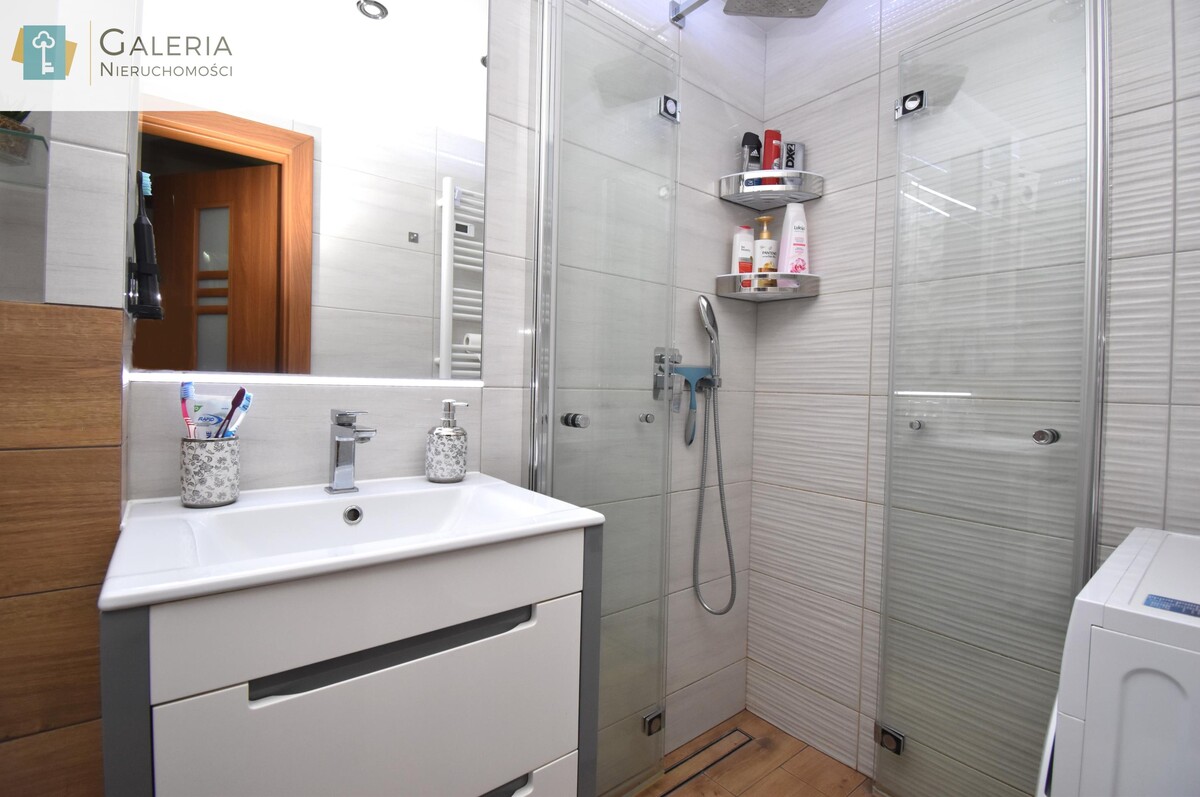 - Łazienka - przestronna, wyposażona w składaną kabinę prysznicową, WC, umywalkę oraz pralkę. Nowoczesne wykończenie zapewnia funkcjonalność i komfort.