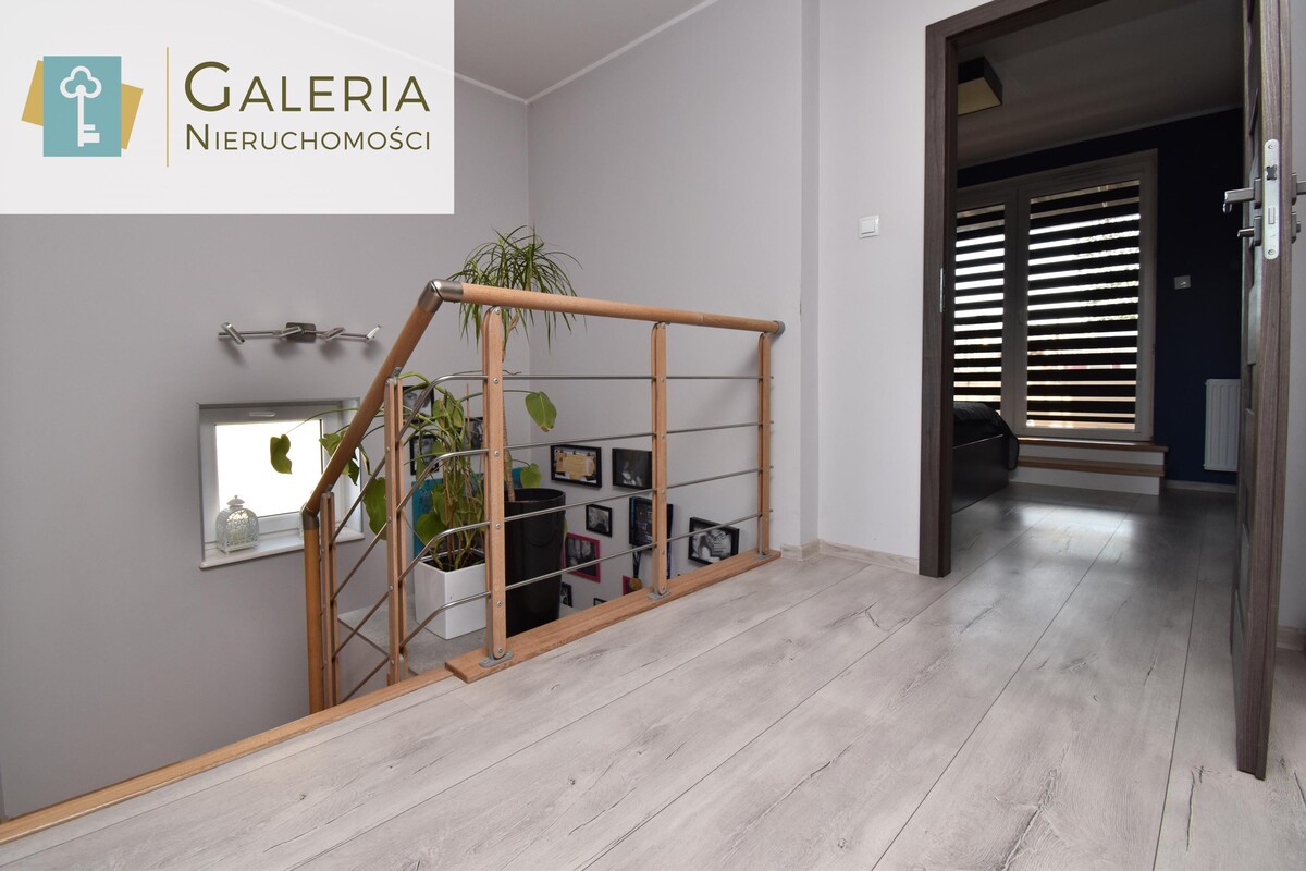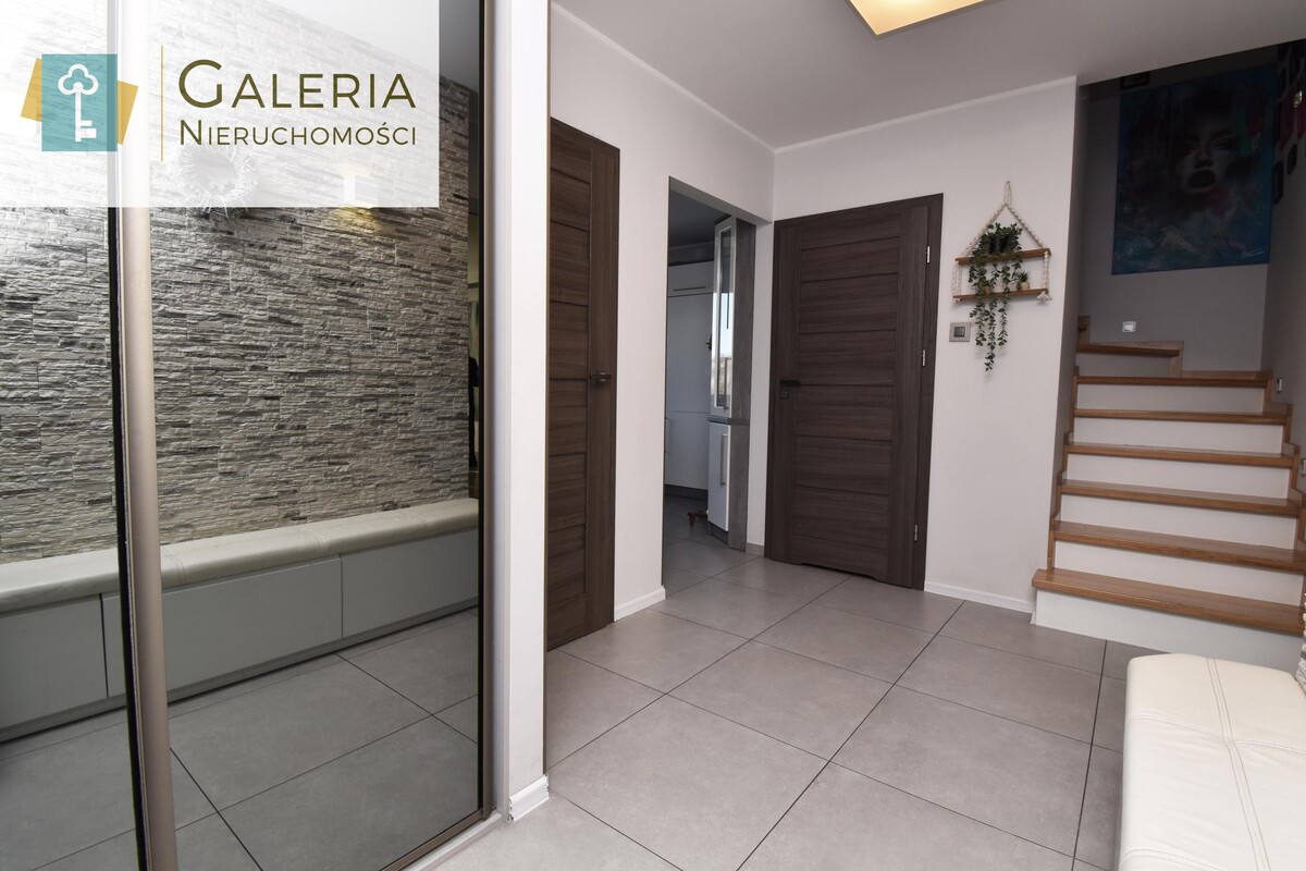 - duży przedpokój z szafą w zabudowie oraz eleganckie, drewniane schody prowadzące na górną kondygnację.